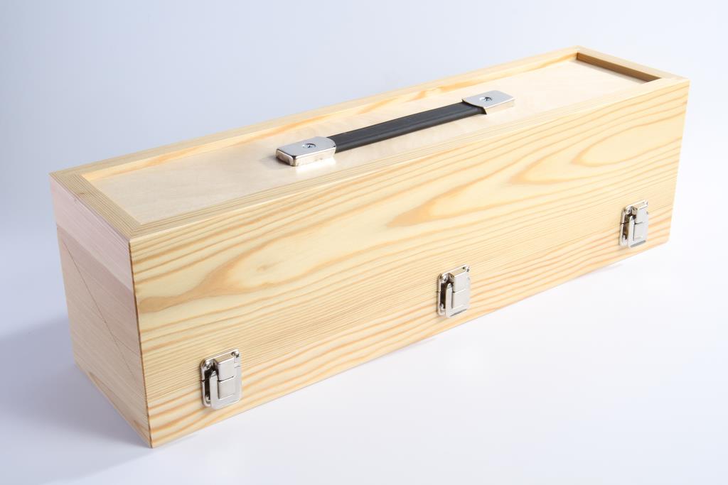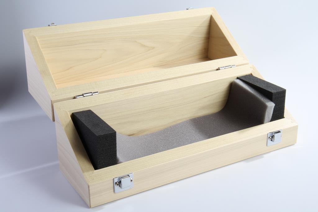 Die mit Handgriff versehenen und stapelbaren Boxen sind aus verzahntem und farblos lackiertem Massivholz gefertigt. Sie haben drei (die kurzen Boxen nur 2) Sicherheitsverschlüsse und sind in fünf Längen zwischen 31 und 83 Zentimeter erhältlich. Der Deckel ist für optimalen Zugriff schräg angesetzt und abnehmbar. Schaumstoffpolster, sind im Lieferumfang enthalten. Die Boxen sind ab 79,- Euro zu haben.