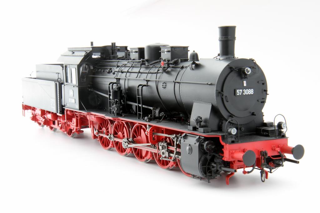 Die preußische G10 / BR 57 wurde ab 1910 in 2589 Exemplaren gebaut und war bis 1968 im Einsatz. Das Modell kommt in sieben Versionen von Epoche 1 (grün/braunrot) bis 4 (schwarz/rot). Die unterschiedlichen Dachlüfter, Schlotformen, Dome und Spitzensignale werden je nach Ausführung berücksichtigt. Das Messingmodell im Maßstab 1:43,5 ist mit Faulhaber Motor und Zimo Digitaltechnik ausgestattet. Alle Türen und Deckel des Modells lassen sich öffnen. Das Fertigmodell kostet 3.650,- Euro, der Bausatz 2.350,- Euro.