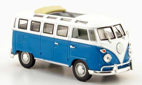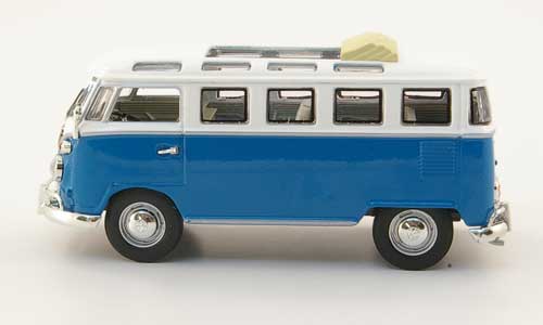 Ist schon Kult, der T1 mit geteilter Windschutzscheibe, mit aufrollbarem Dach, dem klassischen V auf der Front und der schicken Zweifarb-Lackierung. Yat Ming baut den Wagen mitnichten in Wolfsburg, eher in China, und in 1 zu 43. Die Qualität des Modells ist ordentlich, wenn auch nicht überragend, aber dafür ist der Preis freizeitkompatibel.