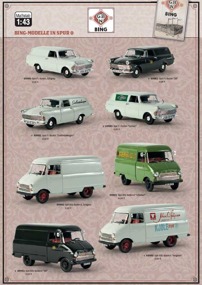 Schon vor Öffnung der Messetore haben etliche Onlinehändler die Neuheitenprospekte und Preislisten online gestellt. Wie daraus ersichtlich ist, wird Brekina / Bing seine Serie mit 1:43 Fahrzeugen fortführen. Basis sind die Modelle des Opel P2 Kasten und des Opel Blitz Kasten. Beide Grundmodelle wird es in je vier Farb- und Bedruckungsvarianten geben.