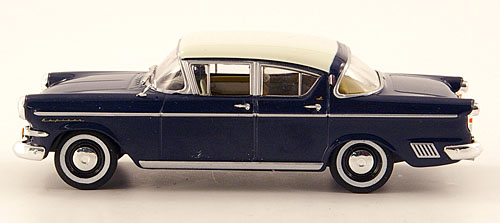 Dabei huldigt die Nobelkarosse der späten 50er einer neuen Stilrichtung. Aus der vormals rundlichen Ponton-Karosserie wurde eine deutlich flachere, gestreckte Silhouette und eigenständige Form. Der 1958 erschienene Kapitän P 2,5 wurde nur ein Jahr lang gebaut und dann schon von seinem Nachfolger P 2.6 abgelöst. Die Modelle kommen in schöner 50er Jahre Farbgebung, in rot, dunkelblau, hellgrau, und hellgelb, jeweils mit weißem Dach.