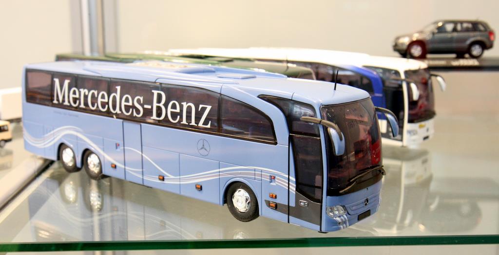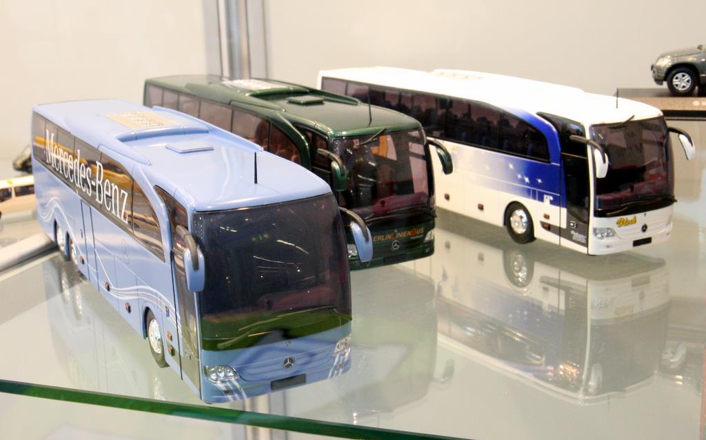 Neu ist der MERCEDES BENZ Travego M Reisebus in der Lackierung „Pressetestfahrzeug“. Das Modell war auf der Messe in einigen Auftragslackierungen zu sehen, die aber leider nicht frei zu kaufen sind, sondern von Auftraggebern aus der Industrie geordert wurden.