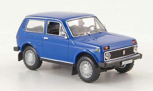 Volles Kontrastprogramm: Der Lada Niva (VAZ 2121), der in den 80er Jahren gebaut wurde, war der Geländewagen für all diejenigen, die wirklich durch den Dreck fahren mussten, lange vor den gezierten SUVs, deren Besitzer aus Angst vor Kratzerchen zu Fuß durch den Modder stapfen. IST Models bringt den robusten Lada in 1:43