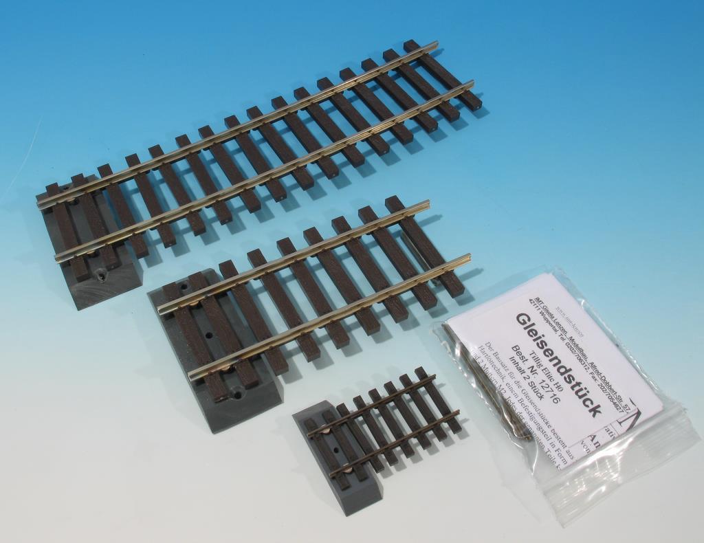 Die Gleisendstücke können in Modul-Endbereichen oder an Segmentübergängen eingesetzt werden. Die Schienenlänge beträgt standardmäßig ca. 130 mm für alle Gleis-Typen der Spur 0, die längere Ausführung ca. 210 mm, um diese leichter in einen Bogen biegen zu können. Die Gleisendstücke können für alle zerlegbaren Gleissysteme hergestellt werden und sind als Fertigteile oder auch als Bausätze erhältlich. Daher variieren die Preise leicht. Ein Preisbeispiel: Der Preis für das Lenz Gleisendstück in Standardlänge als Fertigteil beträgt 12,50 EUR.