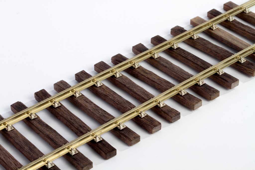 Die Schienenstühle bestehen aus gegossenem Neusilber und sind extrem fein ausgeführt. 100 Stück der Schienenstühle, die am Gussbaum geliefert werden, kosten 43,- Euro. Für einen Meter Gleis sind etwa 140 Stück nötig. Dazu gibt es 100 fertig geschnittene Holzschwellen zum Preis von 62,- Euro. Die Schwellen sind alle präzise vorgebohrt, gebürstet und gebeizt. Die Schienenstühle (und damit die Schienen) werden nicht genagelt, sondern die Schienenstühle in die fertigen Löcher gesteckt und das Gleis dann nur noch aufgefädelt.