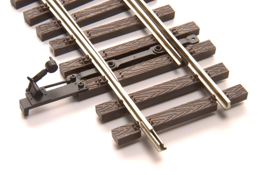 Das funktioniert mit zwei Kreuzschlitzschrauben: Eine fixiert die Stahlschiene, die auch beim Vorbild den Stellbock mit der Weichenschwelle verbindet, die andere hält die Stellstange mit dem Stellmechanismus zusammen. Da auf beiden Seiten eine Anschlussöse vorhanden ist, kann man auch auf einer Seite den Hebel und auf der anderen einen Unterflurantrieb anbringen. Eine Weichenlaterne entfällt bei der neuen Konstruktion, die soll beim elektrischen Antrieb dabei sein.