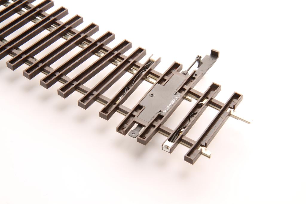 Für den elektrischen Antrieb sind bereits Anschlüsse vorgesehen, und zwar konsequenterweise auf beiden Seiten. Eine kleine zweipolige Buchse, wie man ihn schon von der aktuellen elektrischen Weiche kennt, ist in zwei gegenüberliegenden Schwellen montiert, so dass die Stromversorgung des digital steuerbaren Antriebes auch über die Schienen erfolgen kann. Die Umrüstung kann auch bei bereits eingebauter Weiche erfolgen. Die Weiche kostet 119,50 Euro.