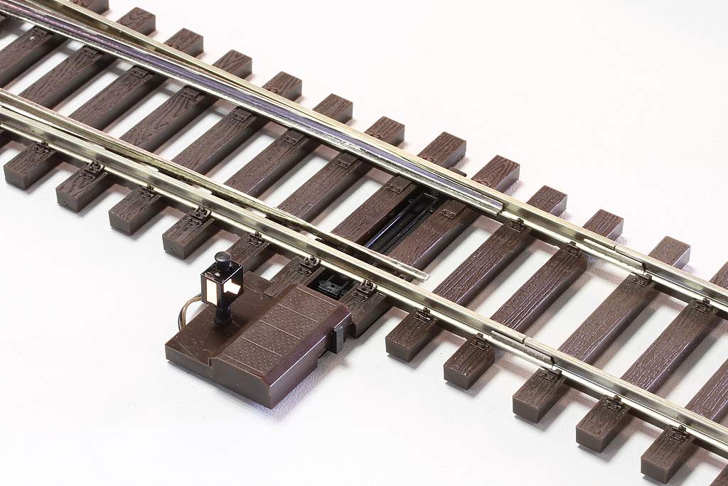Der Unterschied zwischen Handweiche und elektrisch angetriebener Version verbirgt sich in der Weichenantriebsattrappe und den beiden Schwellen direkt neben dem Zungengestänge der Weichenzungen.