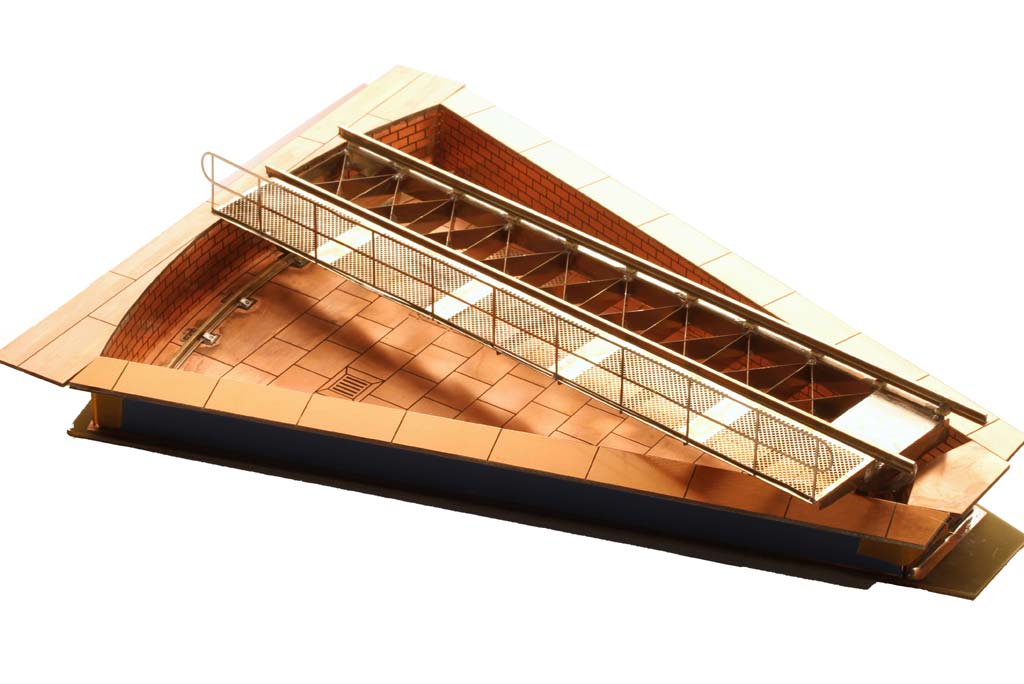 Der Kleinserienhersteller Ndetail stellt den Prototypen einer Segmentdrehscheibe vor. Die eigentliche Drehscheibe ist aus 0,3 und 0,4 Millimeter dickem Neusilberblech geätzt und mit gekreuzten Innenstreben verstärkt, was der Konstruktion eine hohe Stabilität verleiht. Die Gleisbühne ist, wie bei kostenoptimiertem Nebenbahnbetrieb üblich, nur mit einseitigem Laufsteg ausgestattet. (Spart auch Kosten beim Bausatz.) Für problemlosen Dauerbetrieb ist die Drehachse der Bühne kugelgelagert. Eine Bedienerbude ist optional erhältlich.