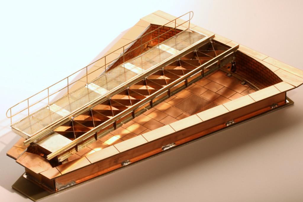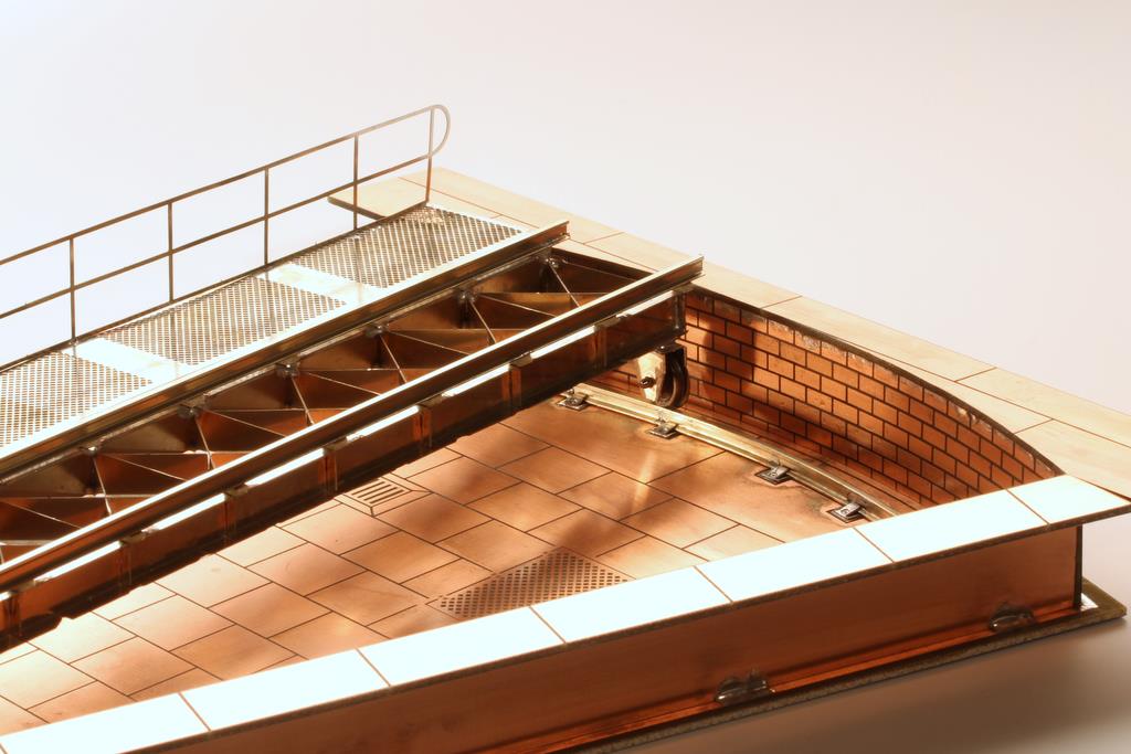 Man macht sich hier gleich drei Eigenschaften des Materials zu Nutze: Hohe mechanische Stabilität durch Glasfasermaterial, lötbar durch Kupferbeschichtung, und schließlich die Möglichkeit, mittels Ätztechnik die Oberfläche zu gestalten. Darüber hinaus ist die Industrie-Massenware günstig am Markt erhältlich. Alles zusammen ergibt das ideale Baumaterial für die Grube der Segmentdrehscheibe. Boden und Wände lassen sich stabil verlöten; die Oberfläche ist darüber hinaus reliefartig geätzt, was eine gute Grundlage für die Farbgebung bietet.