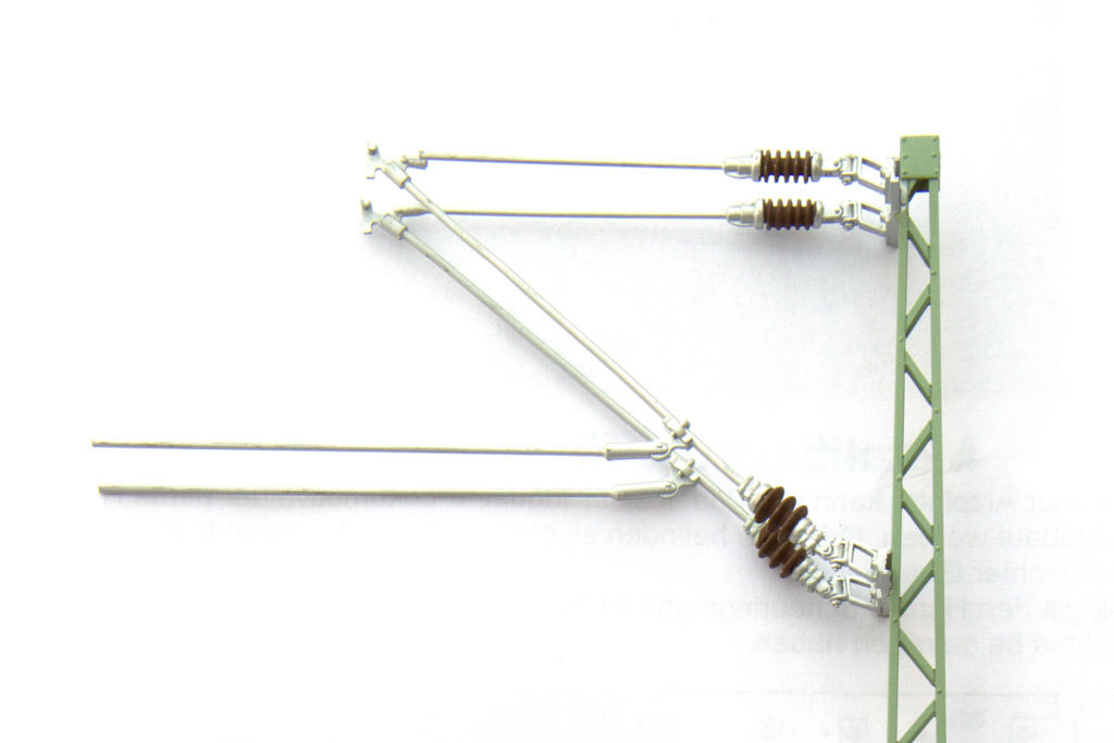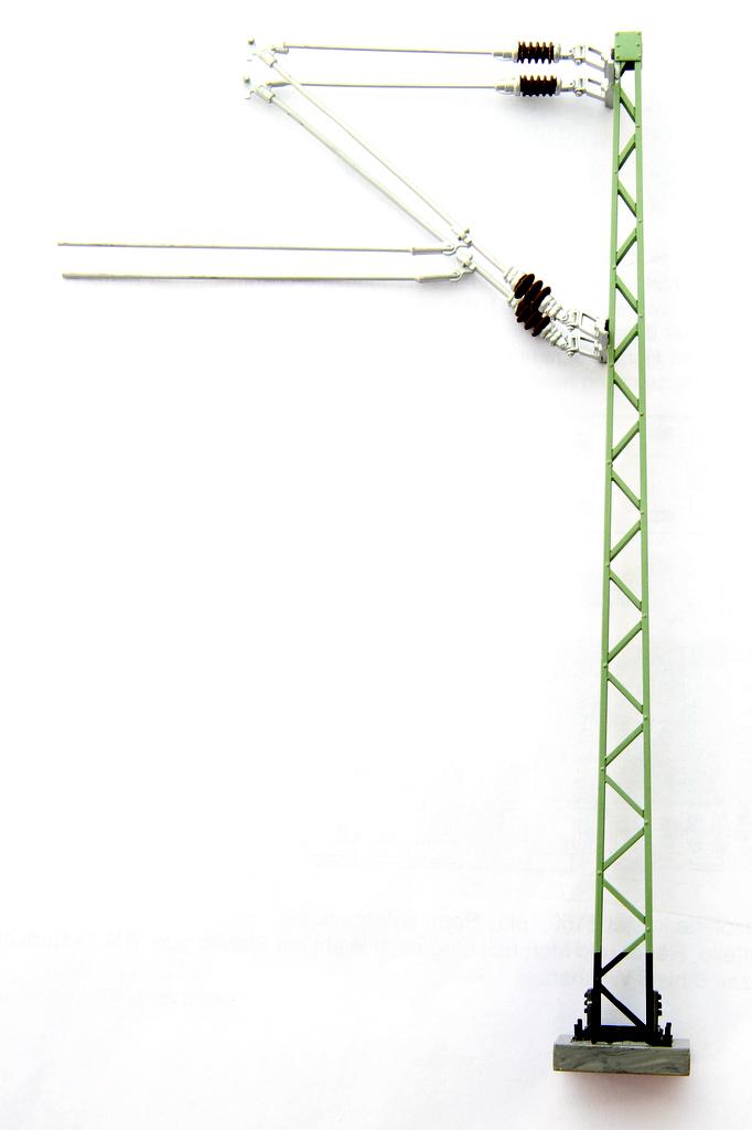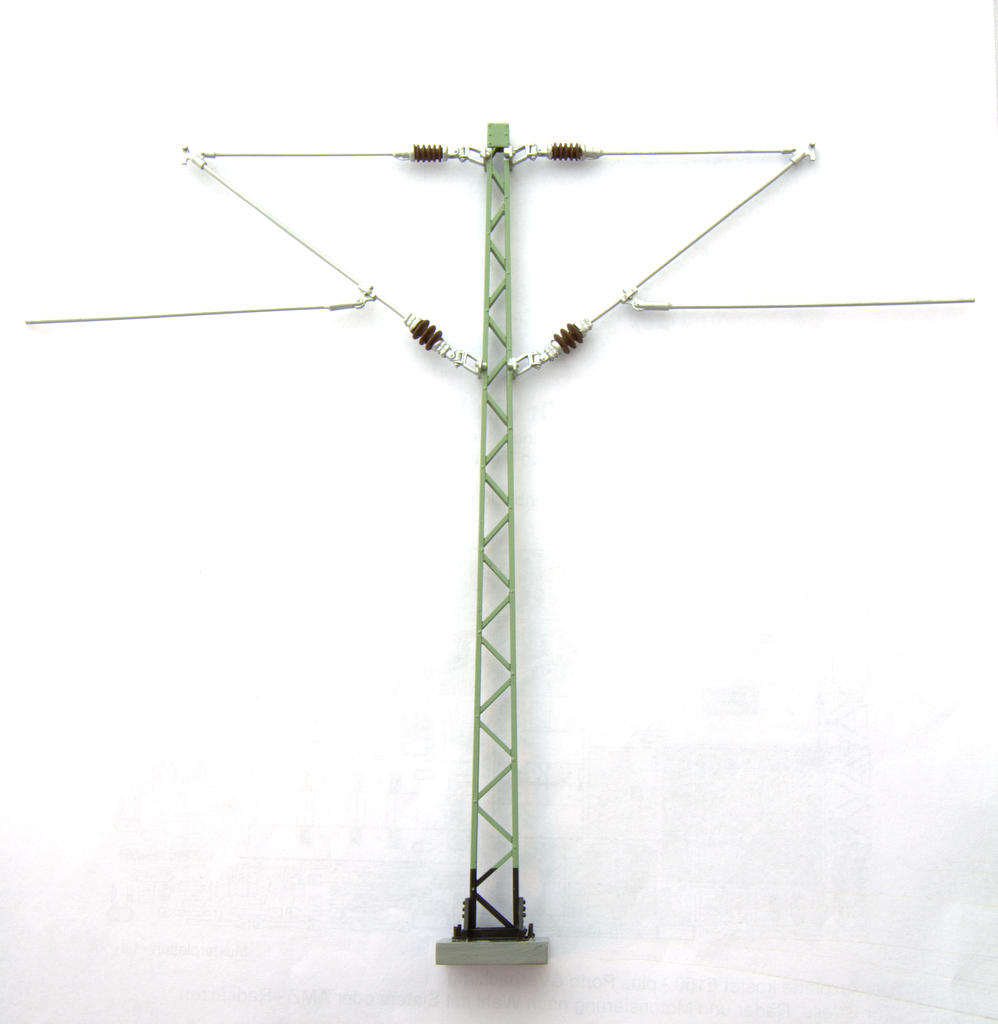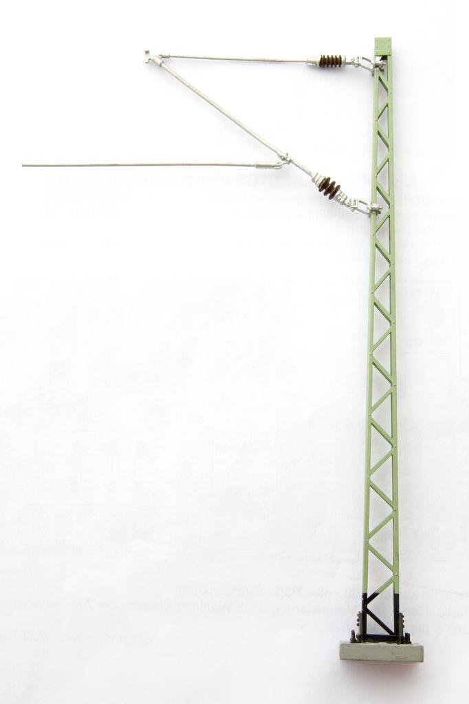 Es gibt die DRG Variante mit diagonaler Verstrebung und die moderne DB Version mit horizontalen Streben. Isolatoren, Masten und Ausleger sind auch einzeln zu haben. Ein fertig lackierter Streckenmast mit einfachem Ausleger kostet 34,- Euro.