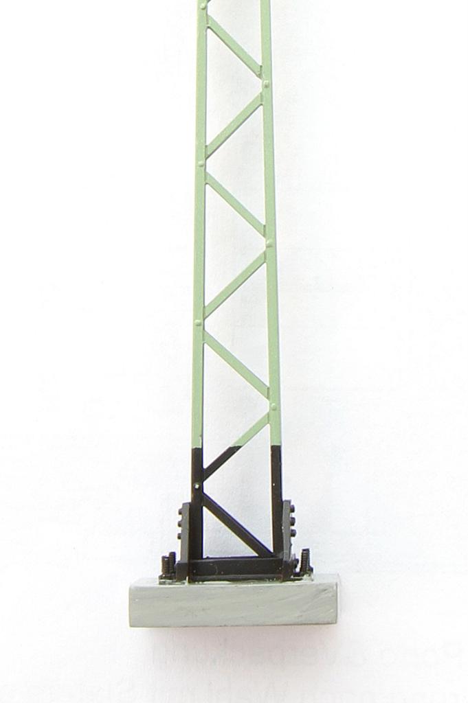 Demko bietet Oberleitungs- Gittermasten als Streckenmasten mit wahlweise einem einzelnen, einem doppelten, oder zweiseitigen Auslegern. Die Masten sind geätzt und haben die typischen Nietenköpfe an den Befestigungen der Verstrebungen, die Isolatoren sind Messinggussteile.