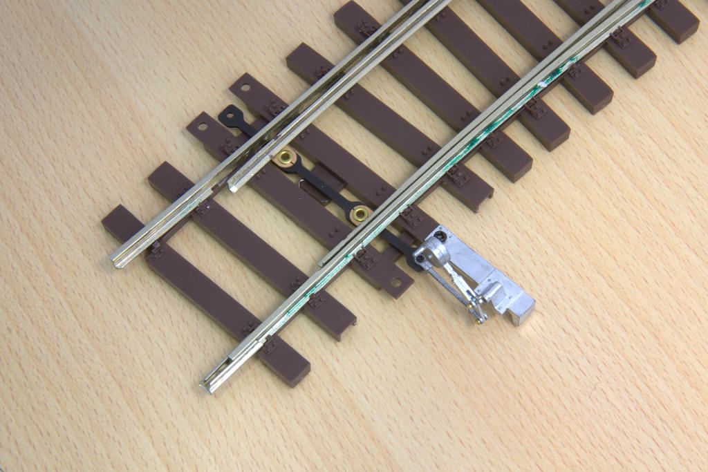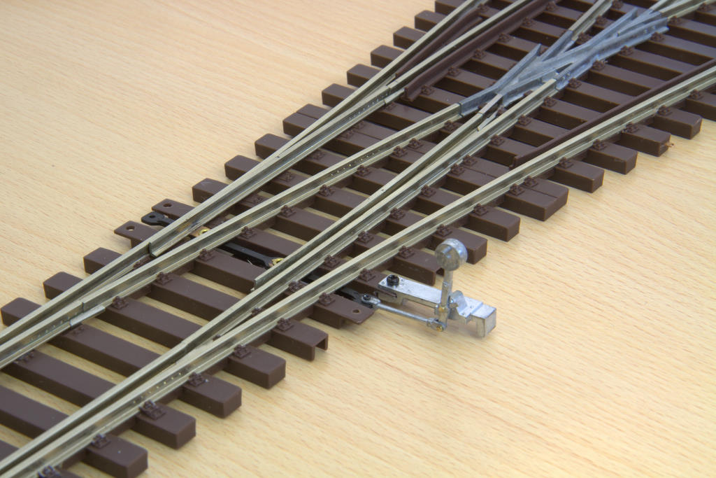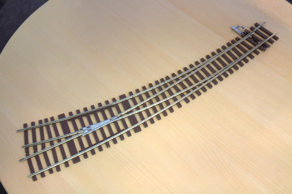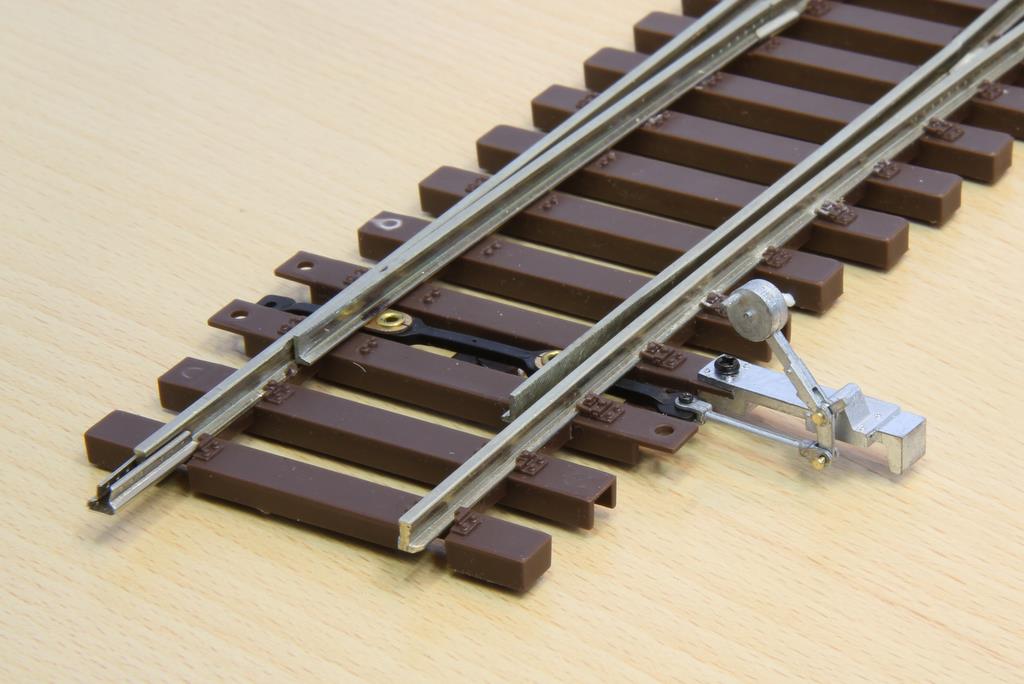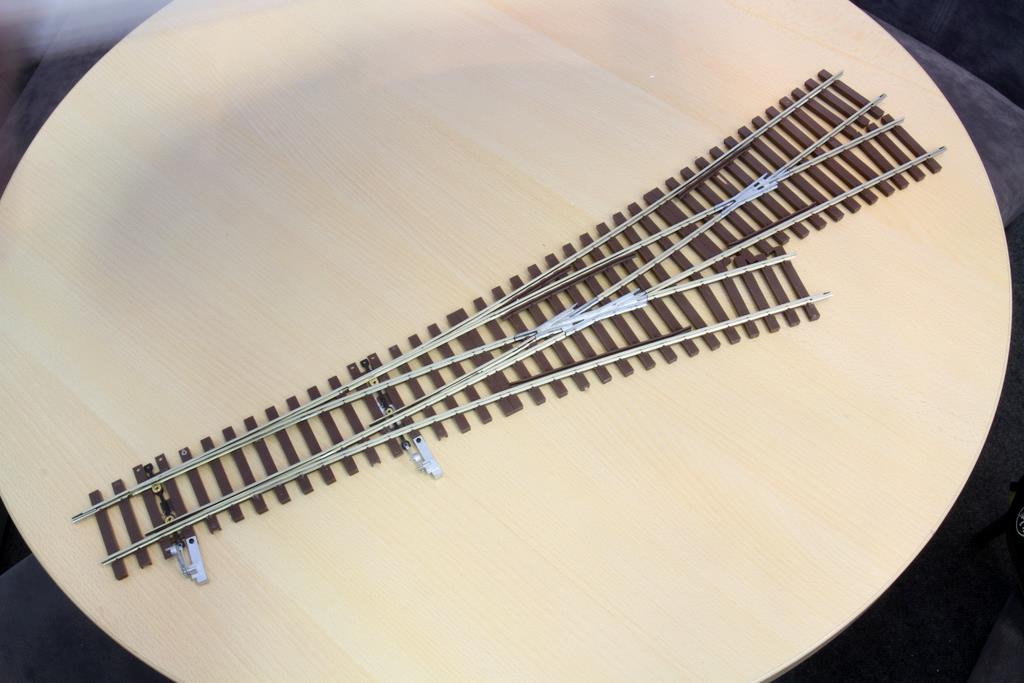 Die Weichenhebel sind bei den Messemustern noch provisorisch befestigt, es handelt sich um eine frühe Version, an der noch Änderungen möglich sind. Die Hebel sind aus festem Zinkdruckguss und daher stabil genug für eine manuelle Betätigung. Die Weichenherzstücke, ebenfalls aus Zinkdruckguss, werden noch vernickelt, so dass sie optimale Leitfähigkeit und eine glatte Oberfläche aufweisen werden.
