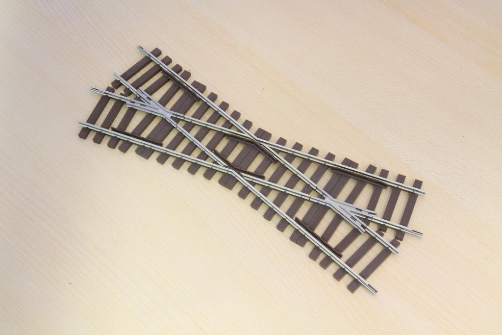 Bei der Betrachtung der Weichen sollte nicht übersehen werden, dass auch die 22,5 Grad Kreuzung mit einer Länge von 277,2 mm fast fertiggestellt ist. Die Kreuzung passt beispielsweise in die Geometrie zum Bau einer doppelten Gleisverbindung, eines sogenannten Hosenträgers.