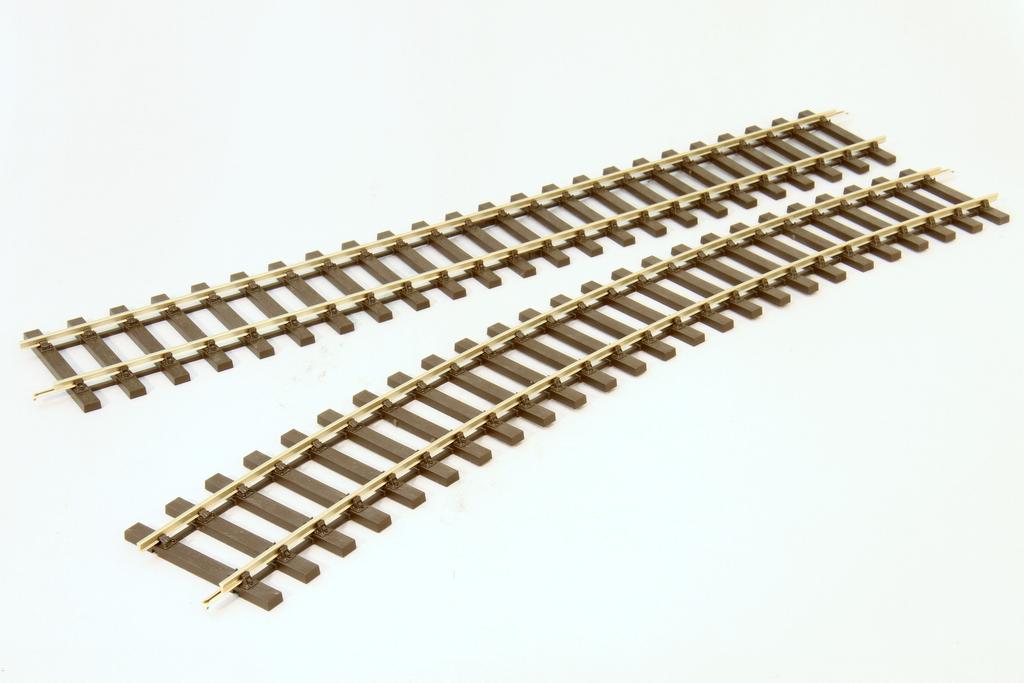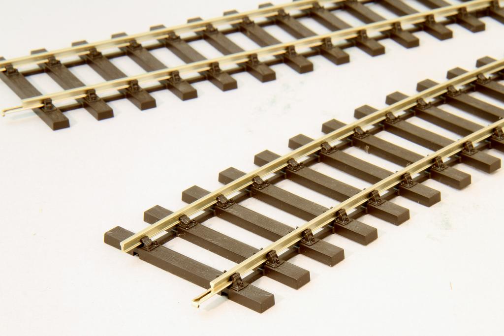 Bisher gab es von Peco in Spur 0 nur Flexgleis und mehrere Weichentypen im Programm, jetzt wurden ein gerades Gleis mit 40 cm (ST-700 für 9,40 Euro) und ein fester Gleisbogen vorgestellt. Der Bogen ST-725 hat 22,5 Grad, damit braucht man acht Bögen für einen Halbkreis. Der Radius beträgt 1020 mm (). Die Kleineisen entsprechen dem britischen Vorbild und passen (natürlich) zu den existierenden Gleisen.