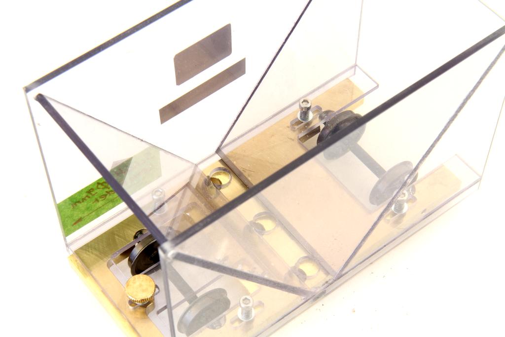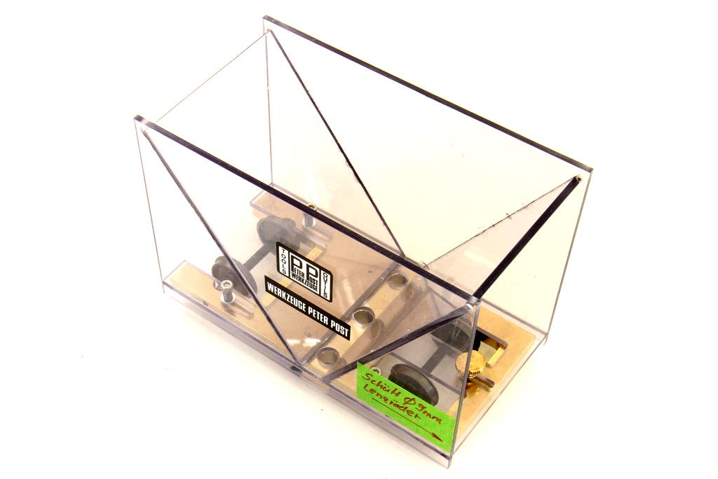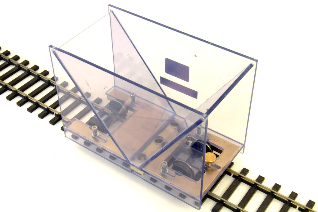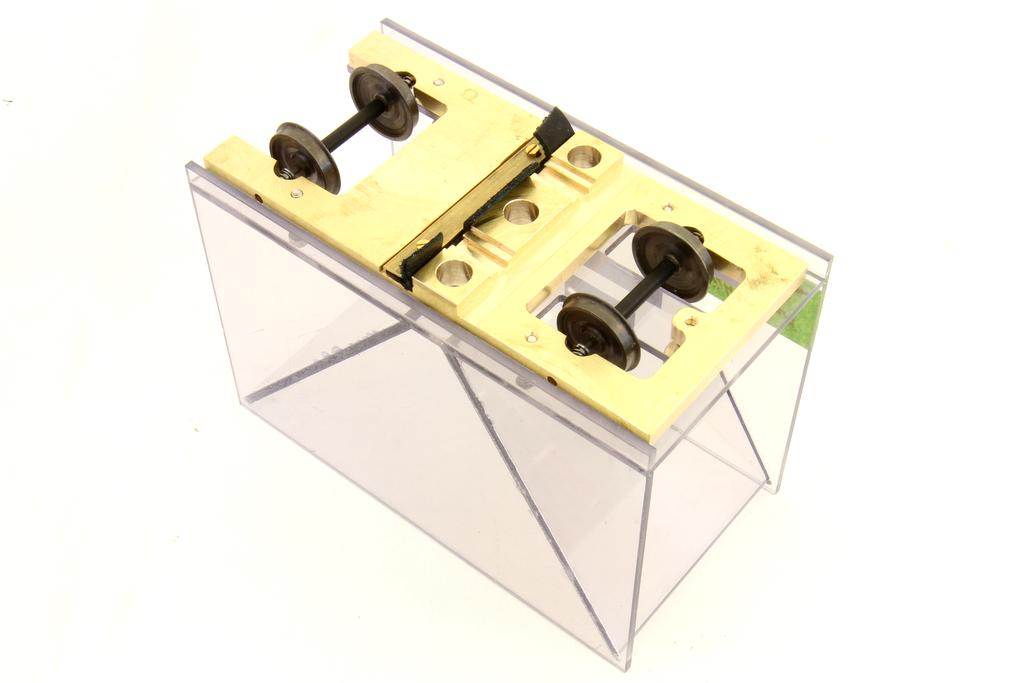 Die Radsätze (von Lenz) sind seitlich gefedert. Der Messingunterbau ist aus einem Stück CNC-gefräst. Die dicken Acrylplatten lassen einen Blick in den Vorratsbehälter zu. Das rollende Werkzeug kostet für Spur Null 175,00 Euro; für Anlagen mit langen Strecken und Clubs zweifellos eine Arbeitserleichterung.