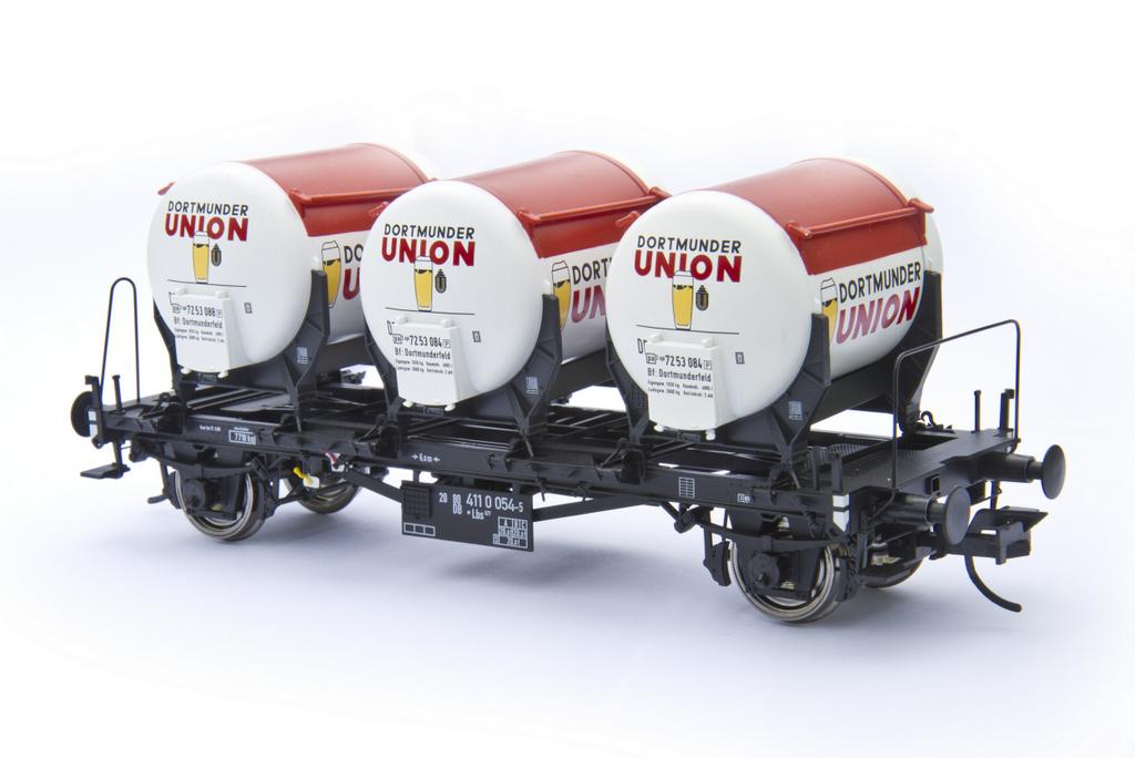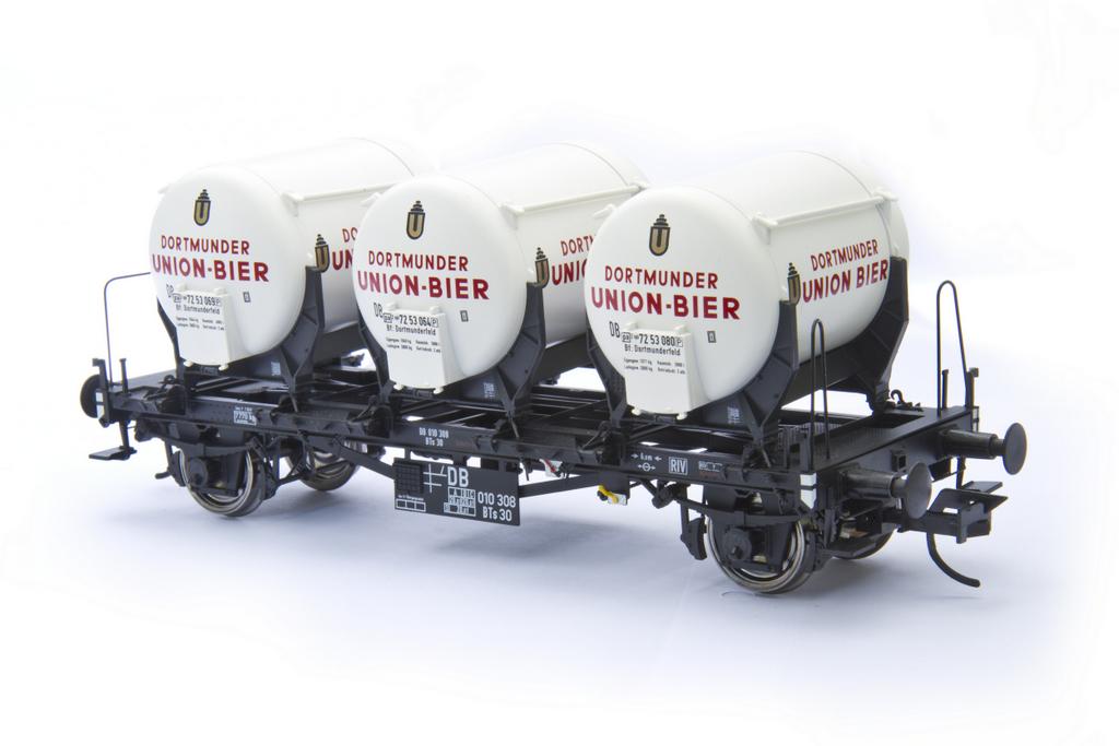 Hoppla, da ist eine Meldung durchgerutscht, sie war in Heft 22, aber noch nicht online. Höchste Zeit, die Wagen in Erinnerung zu rufen: Brawa liefert seit Sommer die neue Versionen des Behältertragwagens BTs30 / BTrs30 / Lbs 577 aus. Neben neuen Betriebsnummern gibt es einen formneuen Bierbehälter in vier Versionen: „Dortmunder Union“ für Epoche 3 und 4 sowie eine standardmäßige silbergraue Haus-zu-Haus Lackierung und dazu blaue „Mönchshof Bräu“ Behälter. Alle Varianten kosten 139,90 Euro.