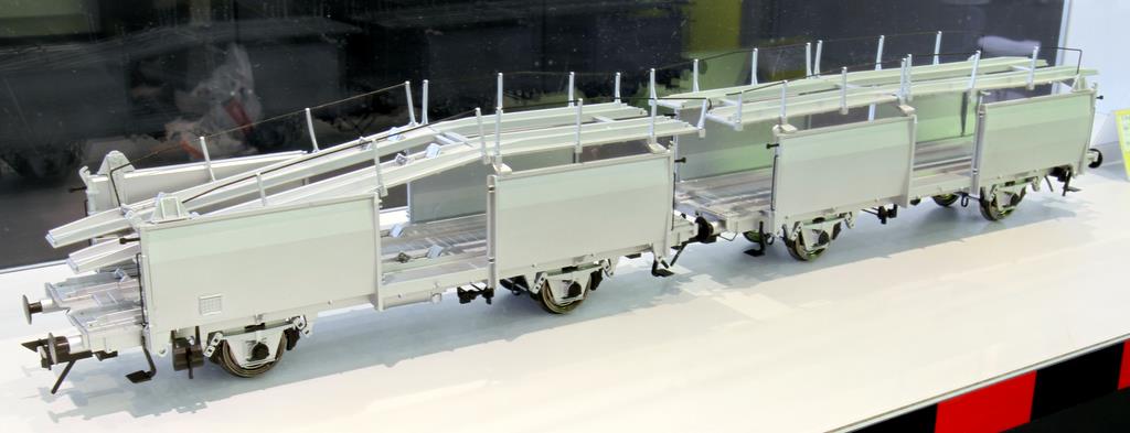 Auch die Off52 Doppeleinheit war als Prototyp zu sehen. Die Autotransportwagen verfügen über eine herunter klappbare Rampe und viele Details wie aufwendige, frei positionierbare Vorlegekeile für die PKW Räder und Nachbildung der Innenmechanik. Auch die durch den Umbau des Vorbildes nutzlos gewordenen Teile werden im Modell sauber wiedergegeben: Klappenhaken und Türscharniere wurden im Vorbild einfach am Wagen gelassen und werden von Brawa entsprechend nachgebildet.
