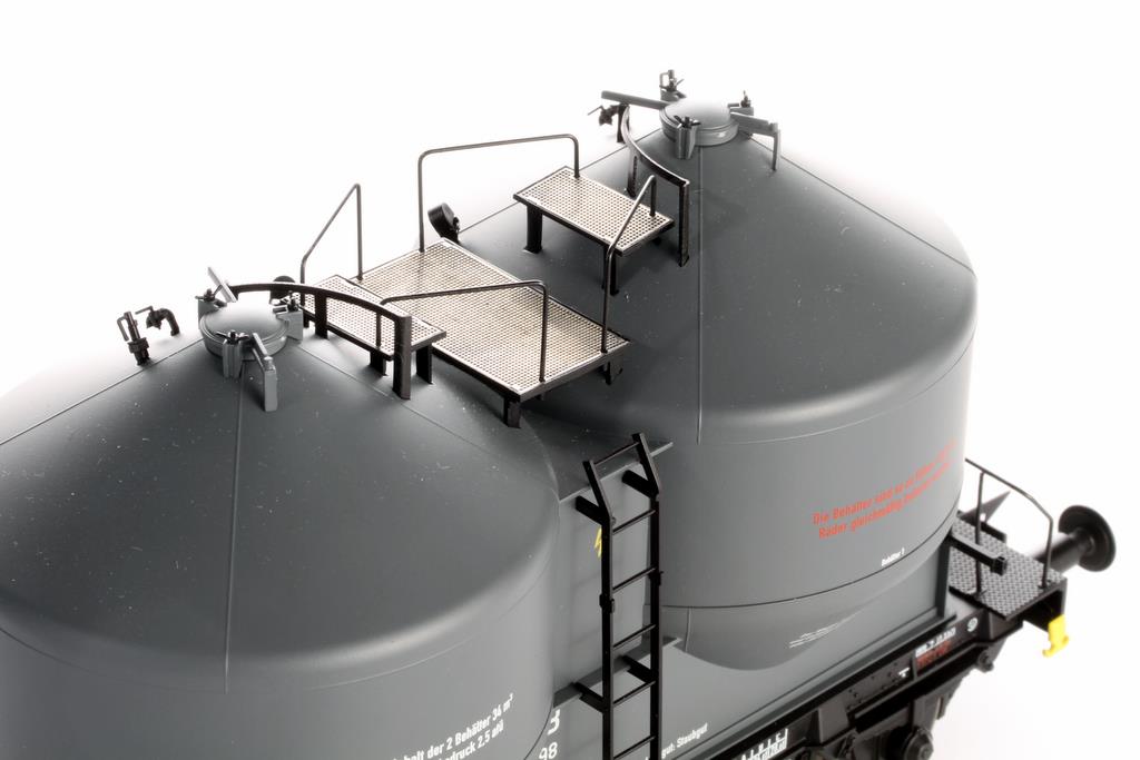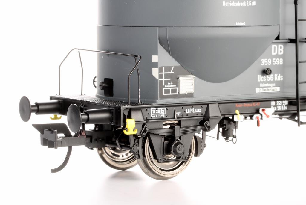 Die Bremsanlage ist komplett, inklusive Bremslösezug und Bremsumstellhebel. Auch Fanghaken, Bremsdreiecke, alles da. Sämtliche Bremsarmaturen sind bereits farbig mit zwei roten und einem gelbem Hebel ausgelegt. Auch die seitlichen Zughaken, die für den Verschub mit Spillanlagen gebraucht werden, sind gelb lackiert. Die großen Hebel für die Be- und Entladung der Behälter sind ebenfalls rot hervorgehoben.