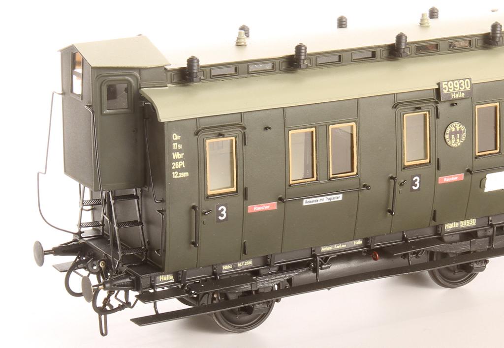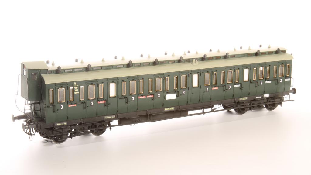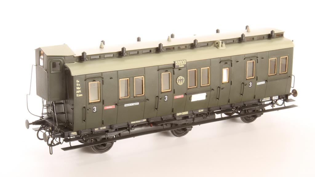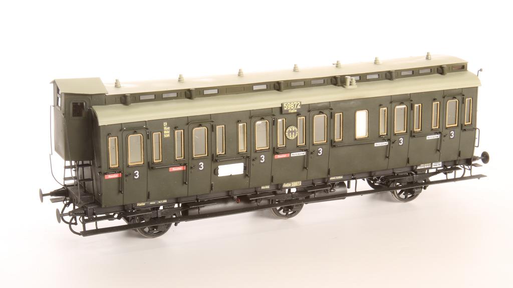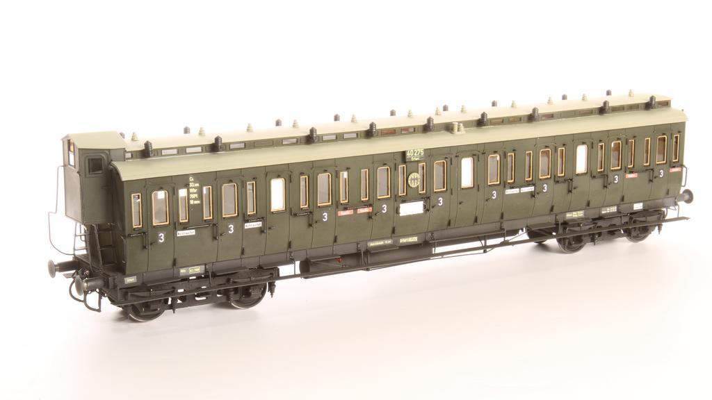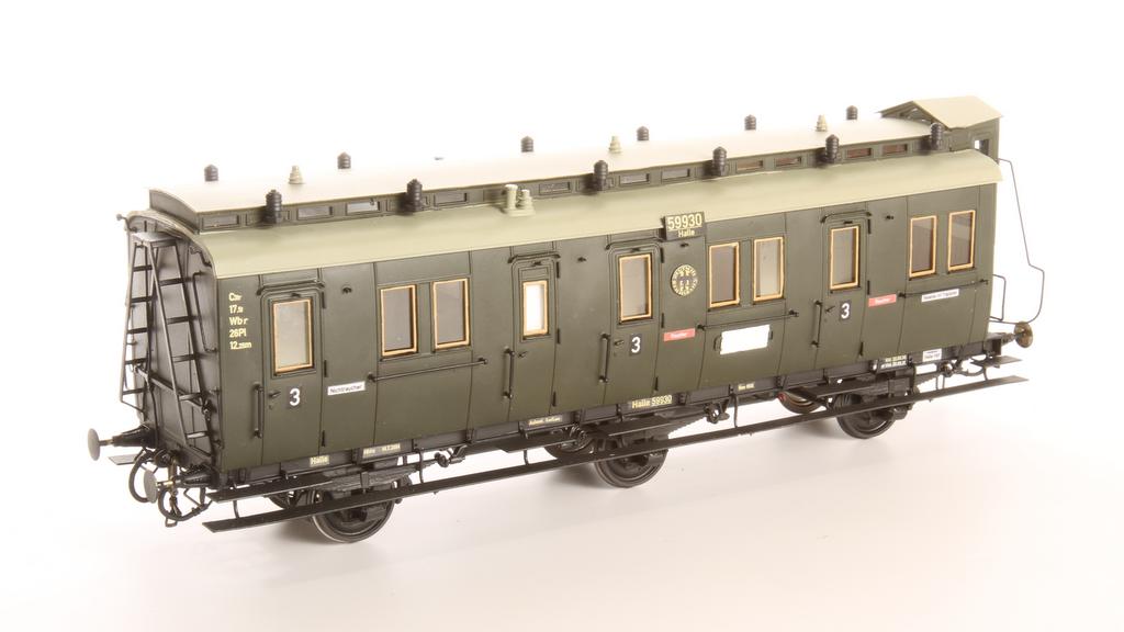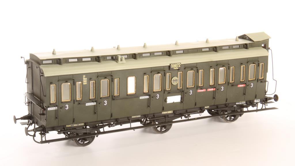 Lieferbar sind jetzt der preußische Abteilwagen BC4 pr.05 (2. und 3. Klasse), der C4 pr.04 (3. Klasse), und passend der preußische Packwagen Pw 4 pr.16 und Postwagen Post 4b/17. Als Ergänzung kommt der dreiachsige preußische Abteilwagen C3 und die Variante C3tr mit Traglastabteil dazu. Weitere passende Wagen sind in Vorbereitung. Ganz nach Wunsch werden die Modelle in der vielfarbigen Lackierung der Epoche 1, oder in Epoche 2 oder 3 lackiert.