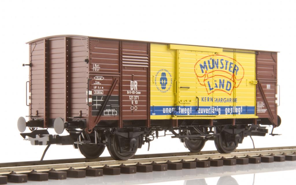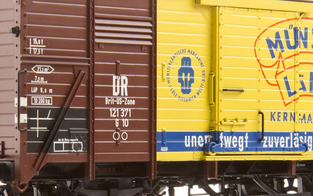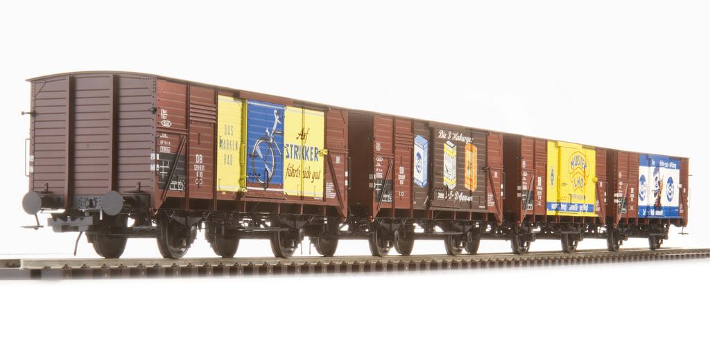 Gleich fünf neue Beschriftungs- und Lackierungsvarianten des gedeckten Güterwagens G 10 werden jetzt neu ausgeliefert. Die G10 waren nach dem 2. Weltkrieg die am meisten verbreiteten gedeckten Wagen in Deutschland, und obwohl sie schon das eine oder andere Jahrzehnt auf dem Buckel hatten, waren sie lange unentbehrlich. Und weil es kaum Alternativen gab, nutzen die jungen Firmen der Wirtschaftswunderzeit die großen Seitenflächen für ihre Reklame.
