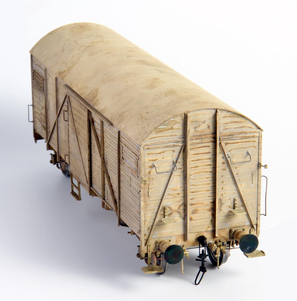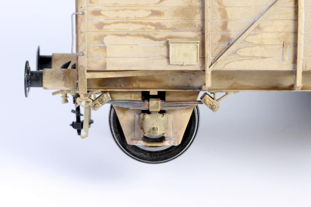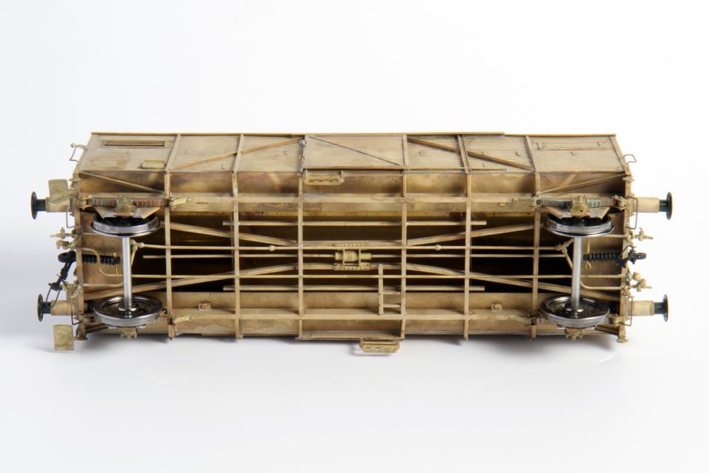 Der Wagenkasten besteht aus 0,5mm starkem geätztem Messing und Gussteilen. Dabei sind die Puffer nicht durch den Rahmen durchstoßend, sondern von hinten verschraubt. Der Wagenboden ist aus Echtholz mit vorbildgerecht einzelnen Leisten.
