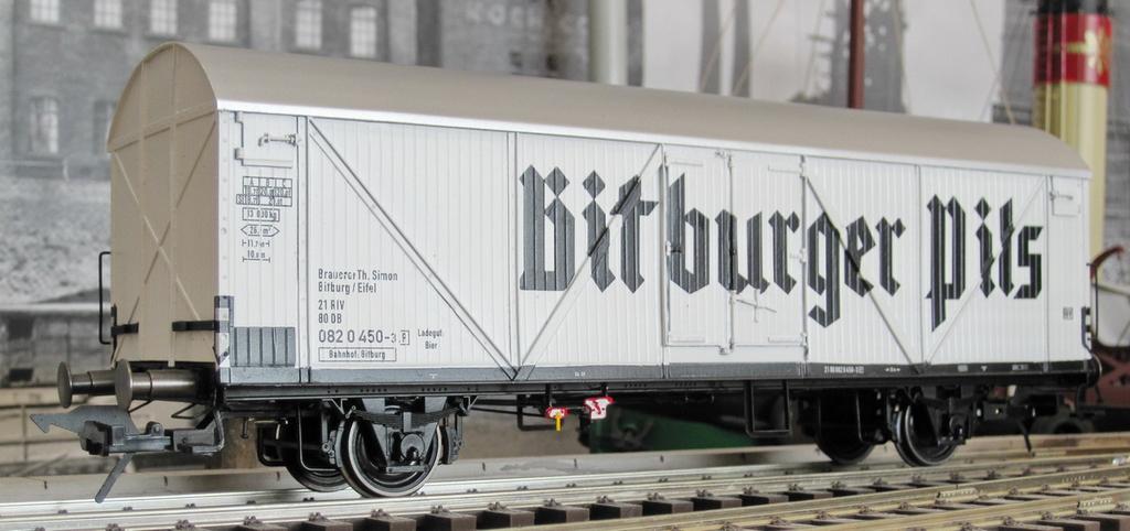 Der Kühlwagen für Bitburger Bier hat die seitlichen Eisluken, aber überraschenderweise ebenfalls keine Lüfter auf dem Dach. Wie das Vorbildfoto zeigt, ist das aber komplett authentisch. Der Bierwagen passt in Epoche 4.