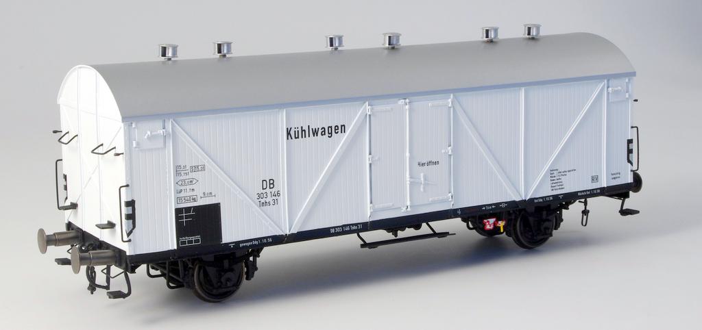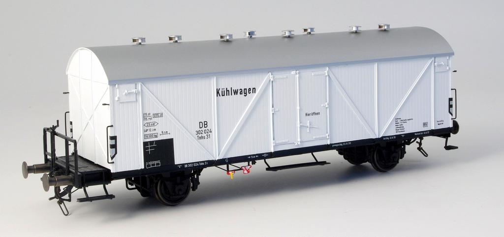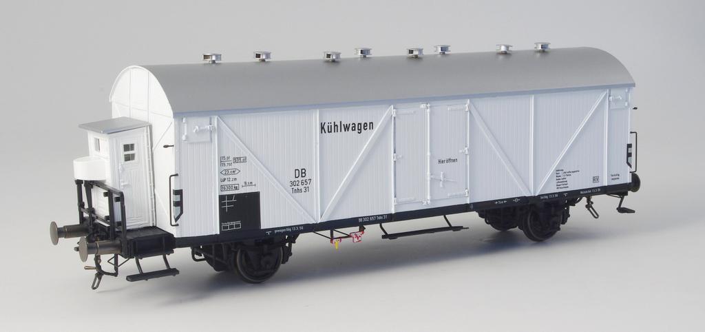 Das Kühlwagenmodell gab es schon einmal in mehreren Versionen. Jetzt wurde die populärste Version noch einmal als Fertigmodell neu aufgelegt: Die weiße Standardvariante der DB mit acht Dachlüftern kostet 269,- Euro. Wahlweise ist auch eine Version mit Bremserbühne oder Bremserhaus zu haben; sie kostet 279,- Euro.