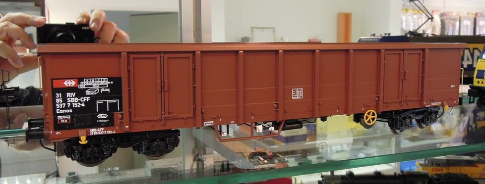 Die offenen Wagen Eanos und die Kesselwagen sollen genau wie die Schweizer Güterwagen K2 und Kühlwagen nach gleichem Vorbild in allen Ausführungen im Oktober / November 2011 mit dem Schiff in Europa eintreffen. Die vierachsigen Modelle werden 139 SFr. Kosten (6er Set 699 SFr.), die Güterwagen 124 SFr. (6er Set 649 SFr.) (Zur Info: Der derzeitige Wechselkurs: 1 SFr. = 0,8192 EUR). Die Wagen kommen mit Kurzkupplungskulisse und fertig montierter Lenz Kupplung. Bremsschläuche und andere Anbauteile liegen bei, Puffer und Wagenboden, bzw. Rahmen sind aus Metall. Auch die Räder sind aus Metall und in Kunststoffbuchsen gelagert.