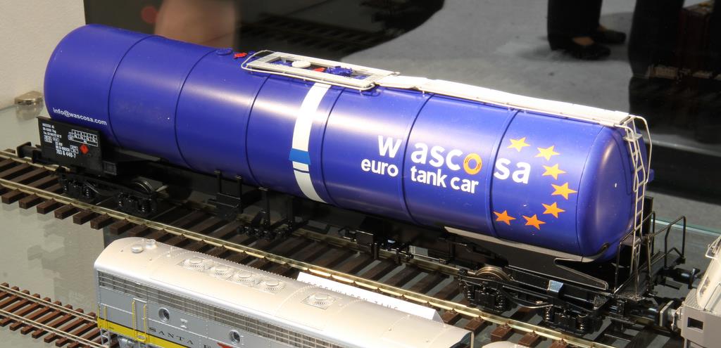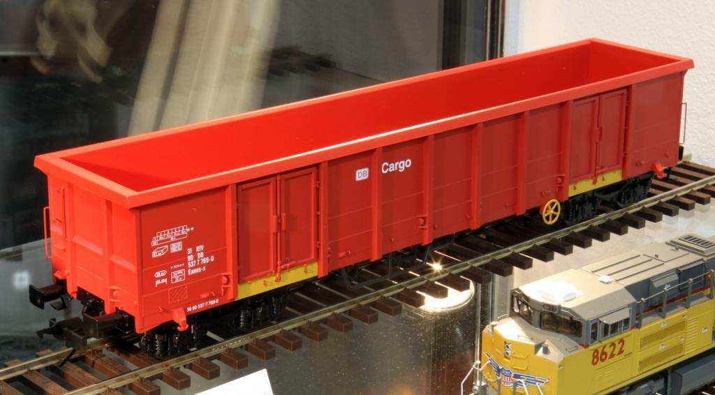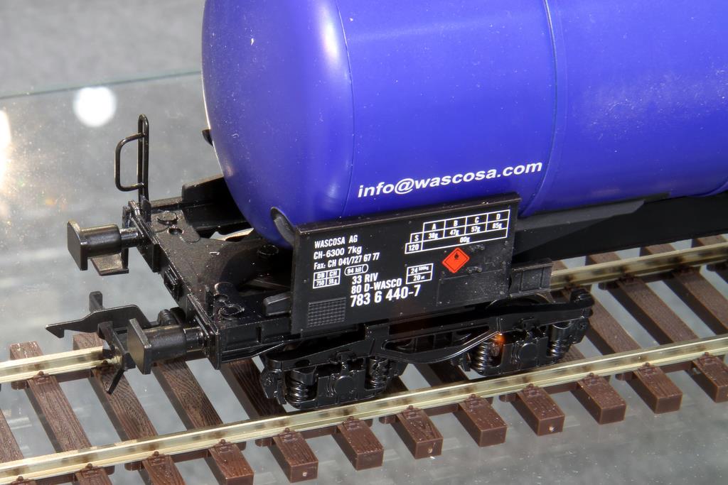 Der offene vierachsige Güterwagen Eanos und ein Kickkesselwagen waren ausgestellt, beide schon komplett lackiert. Beide Modelle haben eine Lenz Kupplung.