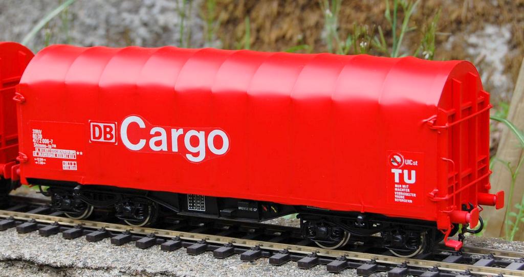 Wer also eher auf Spielbetrieb Wert legt und gerne etwas Abwechslung im Zugbetrieb mit modernem Rollmaterial hat, der sollte mal einen Wagen ausprobieren, als neu sind der kurze Rolldachwagen Shimms (320.- Euro) und der lange Rolldachwagen Rils (340.- Euro) mit knallroter DB Cargo Lackierung gekennzeichnet.