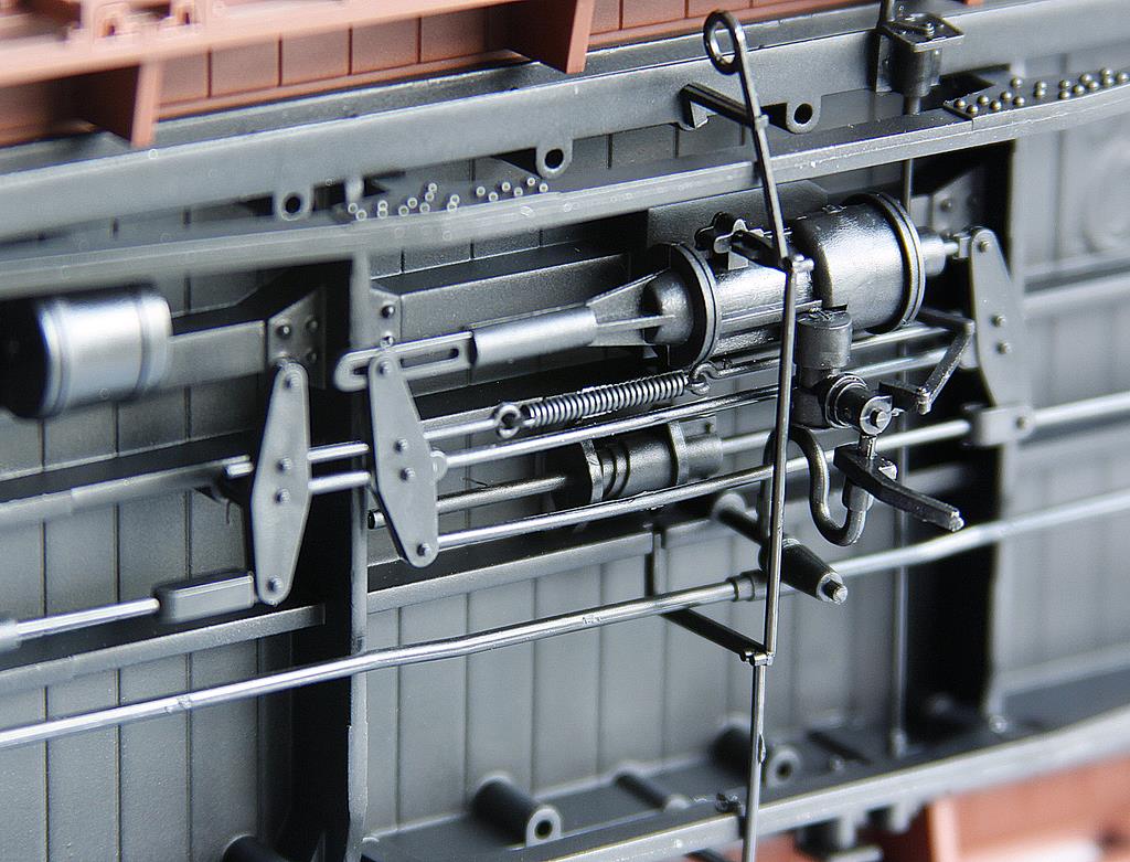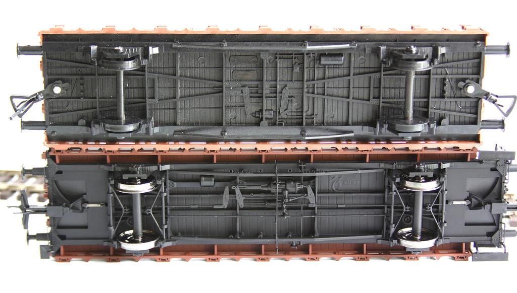 Mit einem Radstand von 155mm, einer Ladelänge von 23,8 und einer Ladebreite von 58mm gibt das Modell sein Vorbild gut wieder, die Ladebreite erscheint mir allerdings ca. 1,5mm zu gering zu sein. Ausgerüstet war das große Vorbild mit der Kunze-Knorr-Bremse (Kk-G), die, so zeigt ein Vergleich mit Abbildungen bei Paul Petau, recht gut nachgebildet ist. Nur Kleinigkeiten wie ein Fangbügel oder die Leitung zwischen Bremszylinder und Luftbehälter fehlen. Bremsdreiecke und Lösevorrichtung sind wiedergegeben. Die Stellvorrichtung für den Lastwechsel verträgt demnächst etwas weiße und rote Farbe.