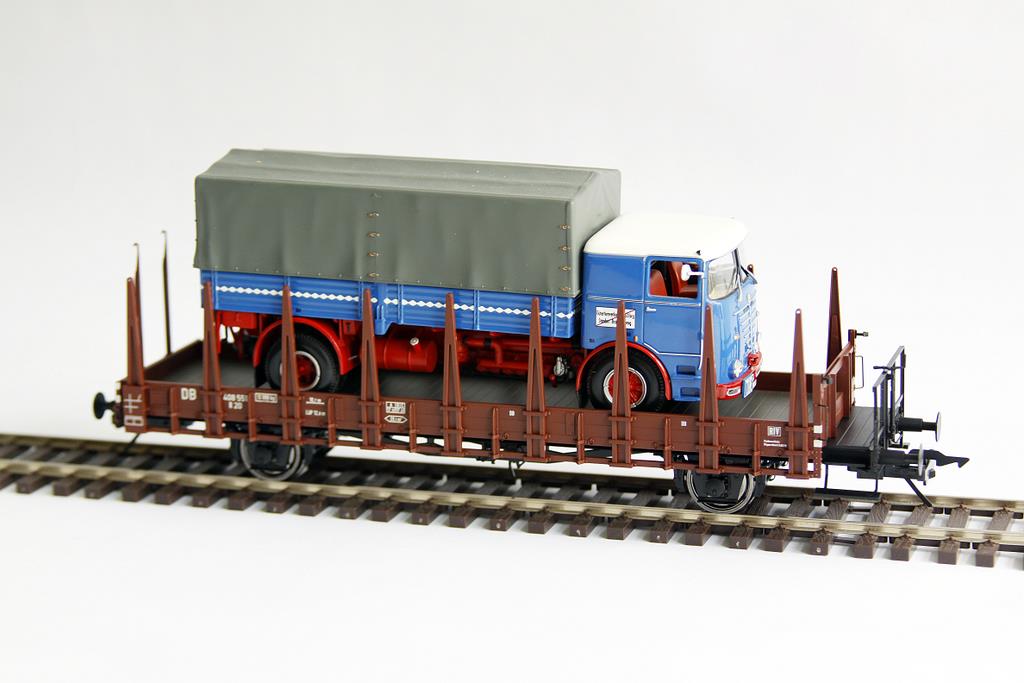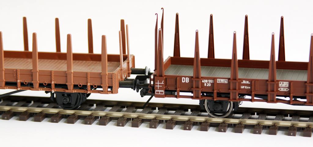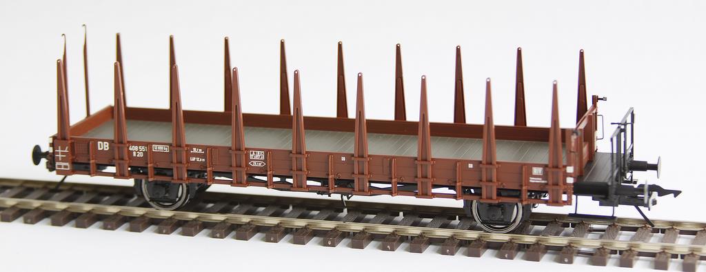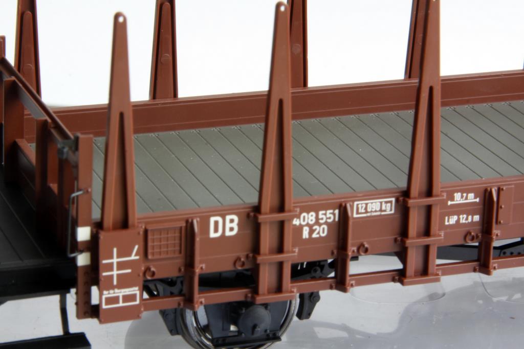 Stelle ich den Rungenwagen wieder auf die (leider) glänzenden, andererseits aber auch von der Innenseite profilierten Räder, findet der Aufbau doch viel Zustimmung. Nicht nur, weil der Gesamteindruck das Vorbild gut wiedergibt. Es sind vor allem viele Details, die gefallen: sehr schön profilierte Pressblechrungen (mit etwas Vorsicht auch herausnehmbar!), das feine Bühnengeländer, die saubere Beschriftung, Rangierergriffe, Signalhalter. Die Seitenwände des Vorbildes bestanden aus Brettern, die Fugen sind auf der Außenseite des Modells sehr fein angedeutet, auf der Innenseite leider nur als ununterbrochene Linien, so als wenn die Bretter 10,72m lang gewesen wären. Auch der Wagenboden hätte etwas mehr Zeichnung gut vertragen. Hier ist ein wenig Nacharbeit erforderlich, oder eben eine schöne Ladung.