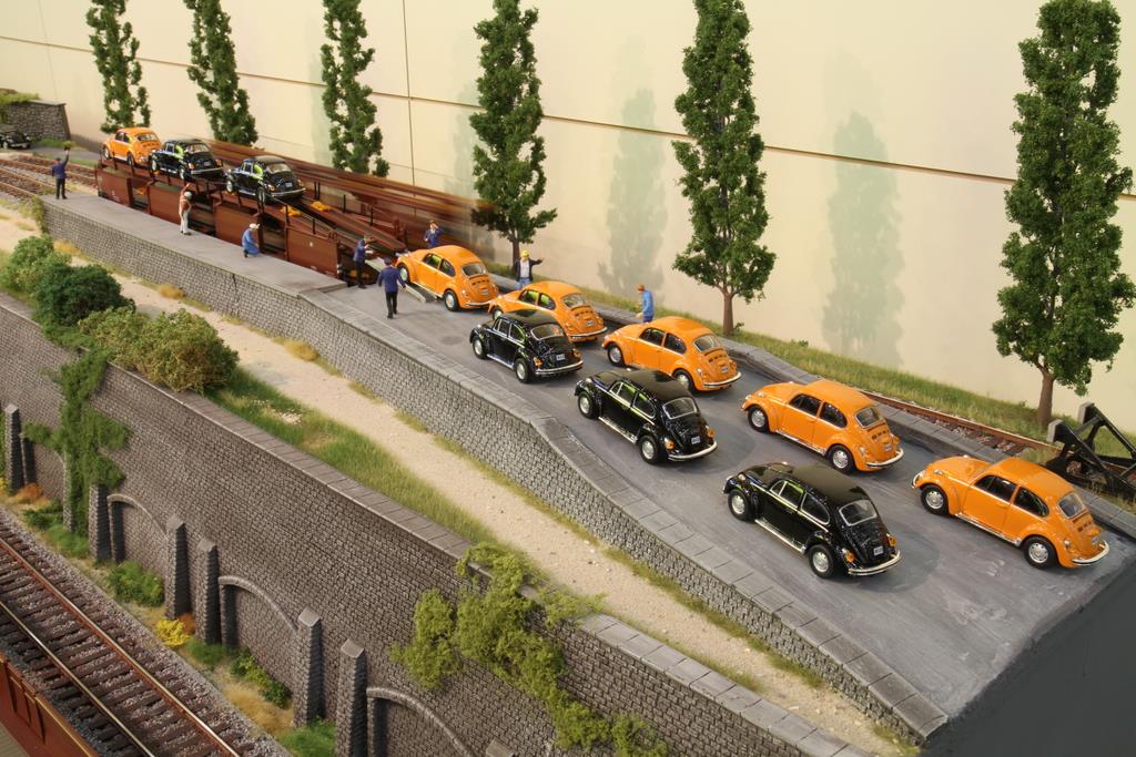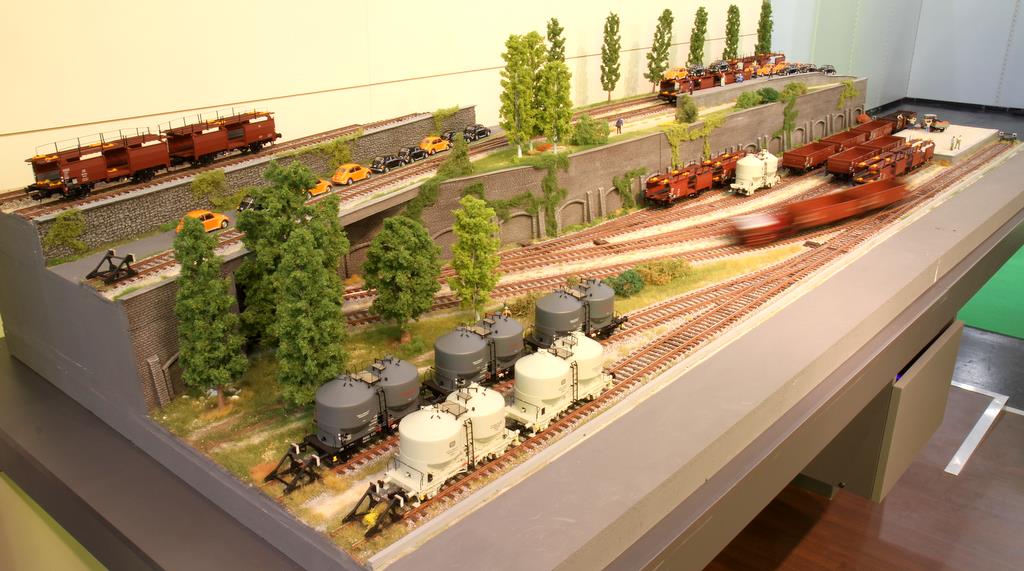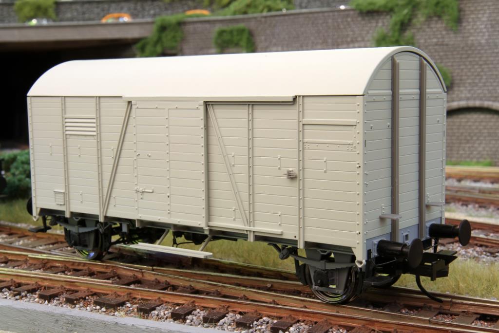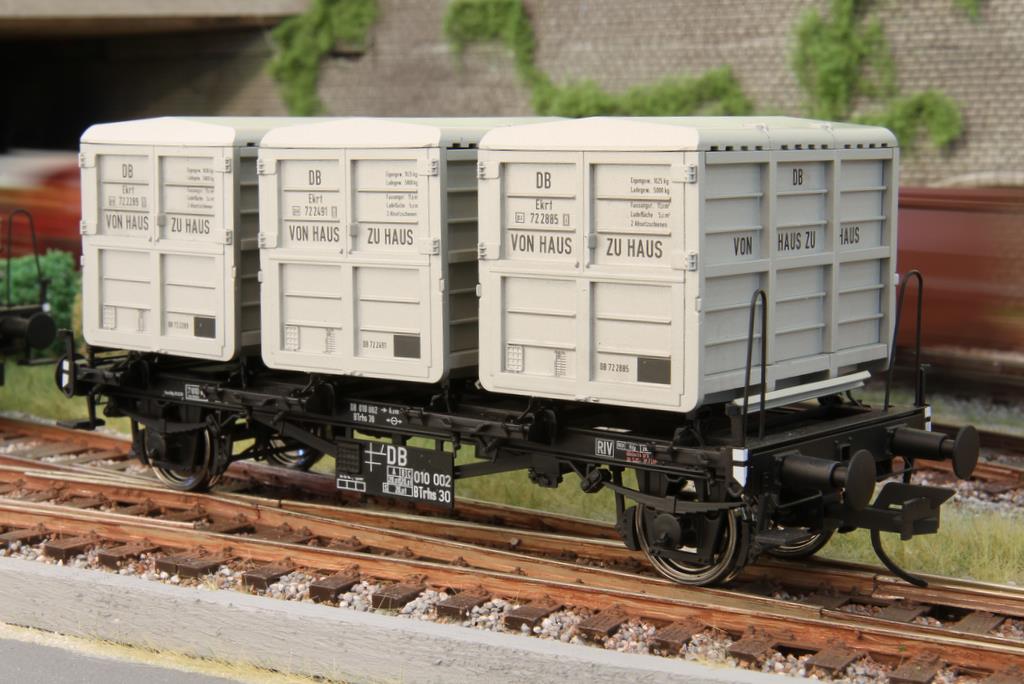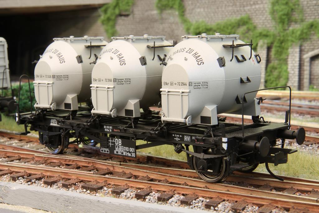 Spannend war es, der Stand der Dinge bei den neu angekündigten Behältertragwagen BTrhs 30 und beim geschlossenen Güterwagen Oppeln zu sehen. In den Vitrinen standen bereits fertige Modelle, zum Teil sogar schon bedruckt. Das Chassis besteht bei den Wagen aus Zinkdruckguss, die Aufbauten aus Kunststoff. Bei der Auswahl der Behälter für den Behältertragwagen hat man darauf geachtet, dass die Behältertypen auch wirklich von Anfang an in Epoche 3 dabei waren. Zu Beginn wurden die geschlossenen Behälter mit diagonal angebrachten Metallstreben verlascht – das Modell hat die Befestigungen und die Streben selber im Ruhestellung vorbildentsprechend an Bord. Sie kamen aber nicht lange zum Einsatz, denn schnell änderte man die Halterung der Behälter am Wagen, um auch andere Behältertypen wie die runden Schüttgutbehälter verwenden zu können, die wegen ihrer Form nicht diagonal mit Streben verlascht werden konnten. Die Behälter sind übrigens im Modell natürlich abnehmbar.