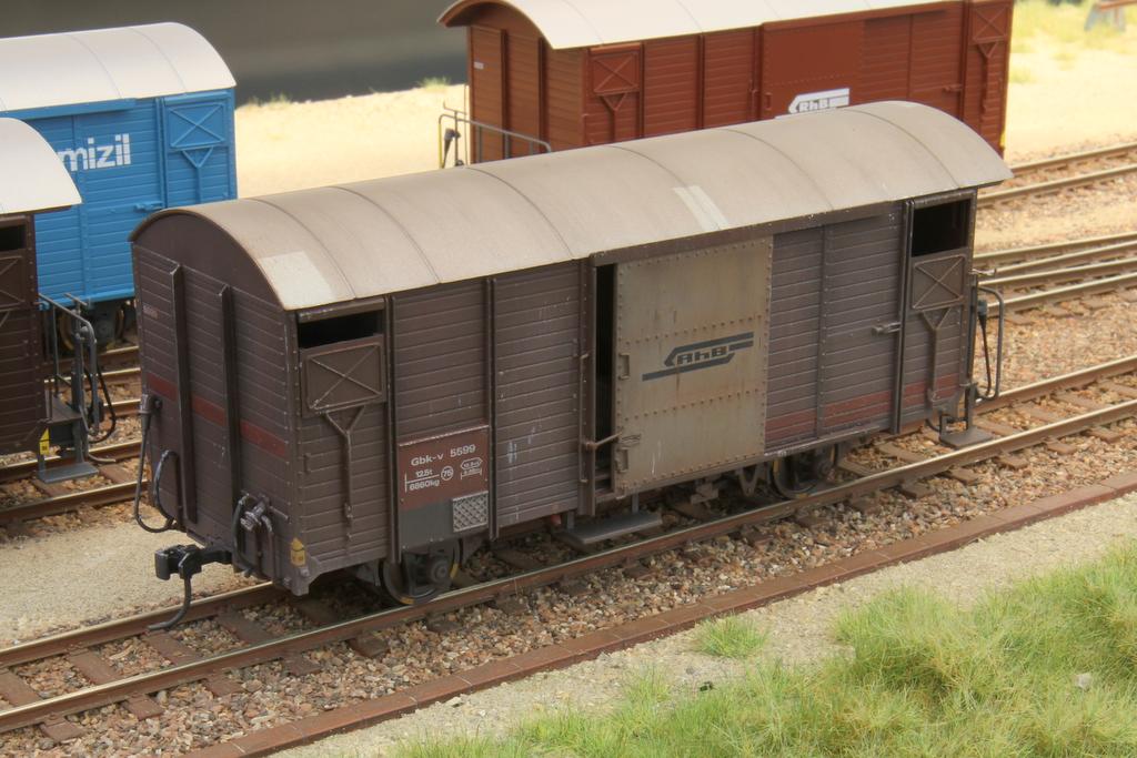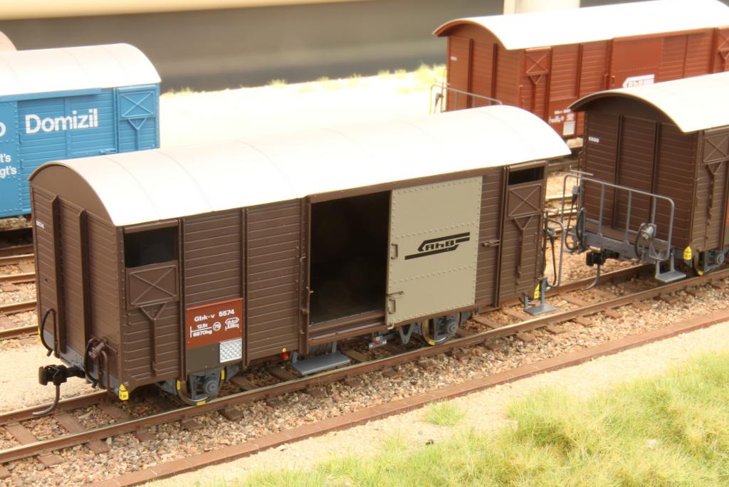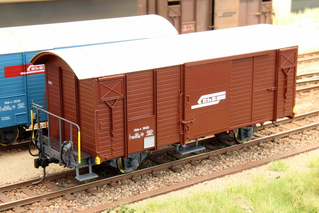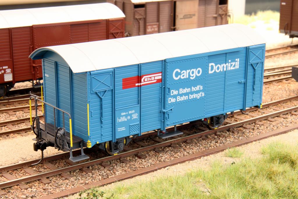 Bereits im Januar 2013 lieferte Bemo die ersten vier Modelle des Schmalspur Güterwagens Gbk-v der Rhätischen Bahn aus: Zwei Nummernvarianten des dunkelbraunen Güterwagens mit silberner Tür, ein brauner und der auffällig blau lackierte mit der Werbeaufschrift Cargo Domizil sind bereits verfügbar.