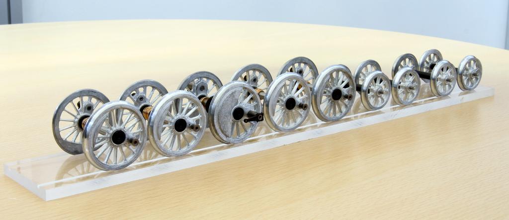 Ausgestellt war der Radsatz der in Entwicklung befindlichen BR 50. Dort ist die Konstruktion abgeschlossen und der Formenbau beginnt. Ein paar Informationen zu der Lok vorab: Bernd Lenz legt großen Wert auf einen maßstäblichen Zylinderabstand und eine stimmige Optik auch von vorne – ein Ziel, das angesichts enger Radien bei einem 5-Kuppler mit Vorläufer keine Kleinigkeit ist. An der Stelle müssen die Hersteller von Modell-Dampfloks die meisten Kompromisse machen. Das Ganze natürlich mit montierten Kolbenschutzrohren. Bei den meisten Messingdampfern muss dieses Detail bei kleineren Radien abgeschraubt werden, das soll bei der Lenz’schen BR 50 nicht nötig sein.