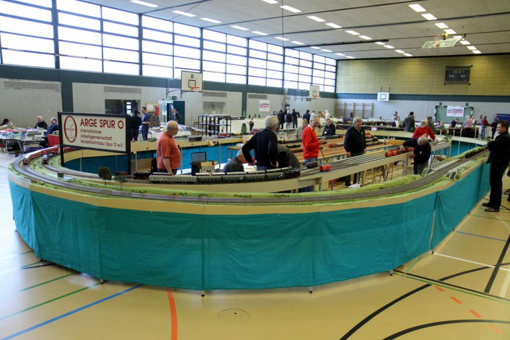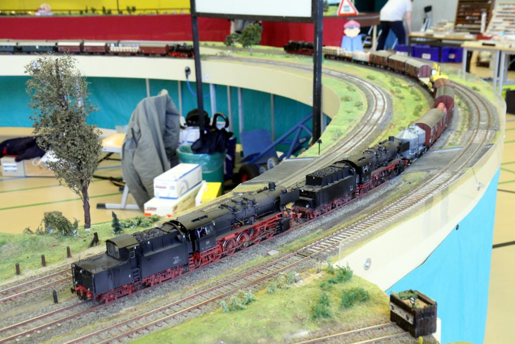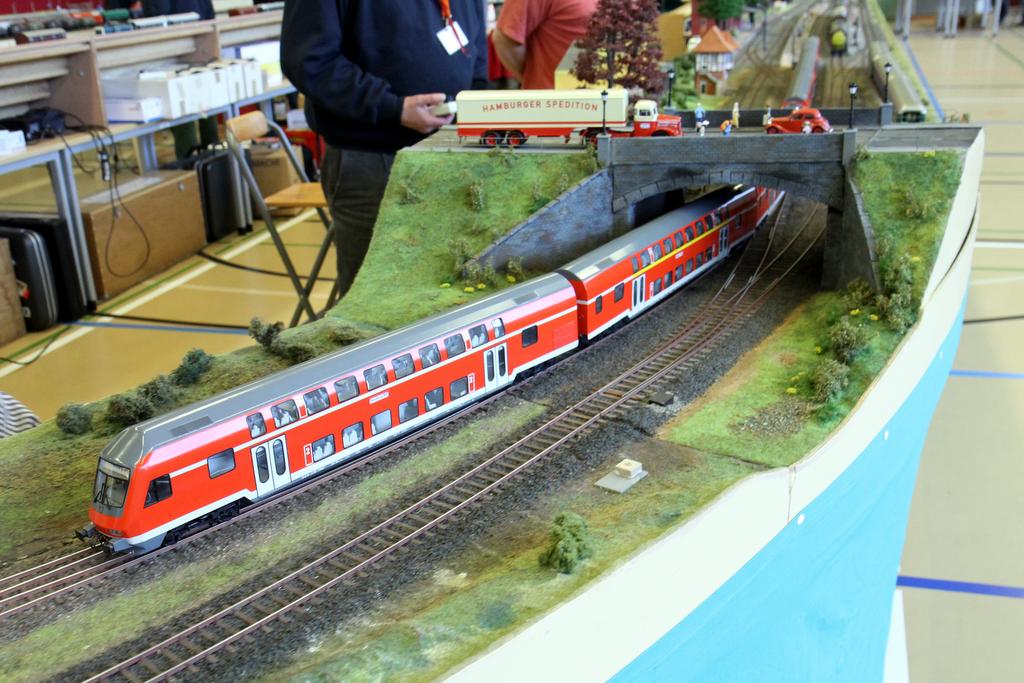 Ebenfalls zu sehen war die große Rundanlage der Spur 0 Modulgruppe Hamburg. Das 17 mal 8 Meter große Oval mit Abstellgruppe wird dazu genutzt, die Garnituren der Mitglieder und Freunde rollen zu lassen. Eine gute Gelegenheit für alle, die zuhause nicht den Platz dafür haben. Entsprechend war das Rollmaterial bunt durch die Epochen gemischt, auch leuchtend rote Garnituren der Epoche 5 rollten über die Gleise – und begegneten einem Güterzug, der in Dreifachtraktion mit drei Lokomotiven der Baureihe 50 gezogen wurde: Zwei Loks vorne, eine schob nach. Das funktionierte im Digitalbetrieb einwandfrei.