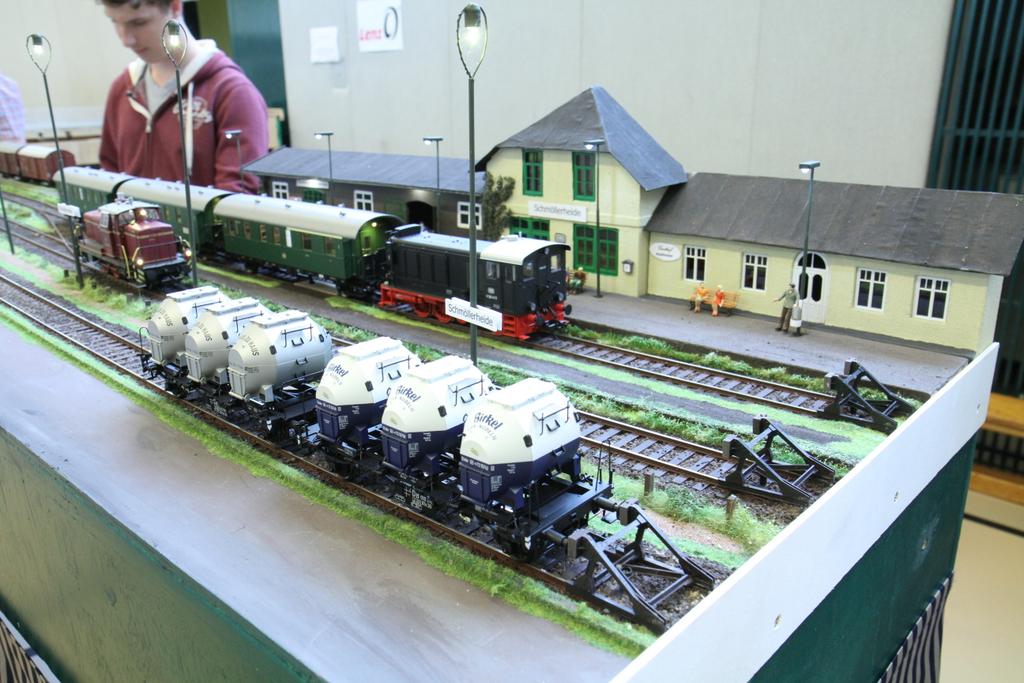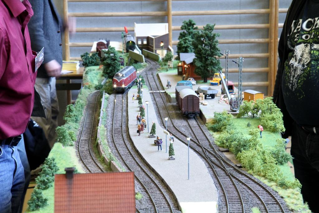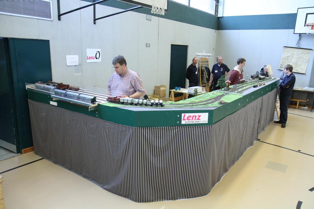 Christian Sube zeigte auf 1,30 Meter Modulhöhe seine private Heimanlage. Die ist in Modulbauweise entstanden und so konzipiert, dass sie zuhause in der Garage aufgebaut werden kann. Entsprechend besteht das Betriebskonzept in gemütlichem Rangieren zwischen Nebenbahnhof und Fiddleyard. Extra für die Ausstellung wurde eine „Ausstellungskurve“ gebaut, die das Arrangement zu einer L-Anlage werden lässt. Alle Fahrzeuge stammen aus aktueller Produktion von Lenz und Brawa, und es war den Betreibern anzusehen, wie viel Spaß der Betrieb mit der Lenz-Kupplung bereitet. Die Gestaltung von Rohbau hin zum fertigen Landschaftsbau erfolgte anlässlich der Ausstellung in wenigen Monaten – ein festgelegter Termin ist immer eine gute Motivation zum Weiterbauen.