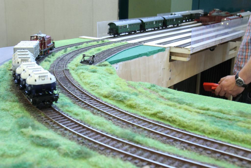 Auch hier wurde das Arrangement für die Ausstellung ergänzt: Die 180 Grad Kurve ist provisorisch auf N-Module aufgebaut. Interessant ist die Umsetzung des Fiddleyards: Eine Schleppweiche, gebaut aus einem Lenz Flexgleis, wird manuell an die Abstellgleise herangehoben.