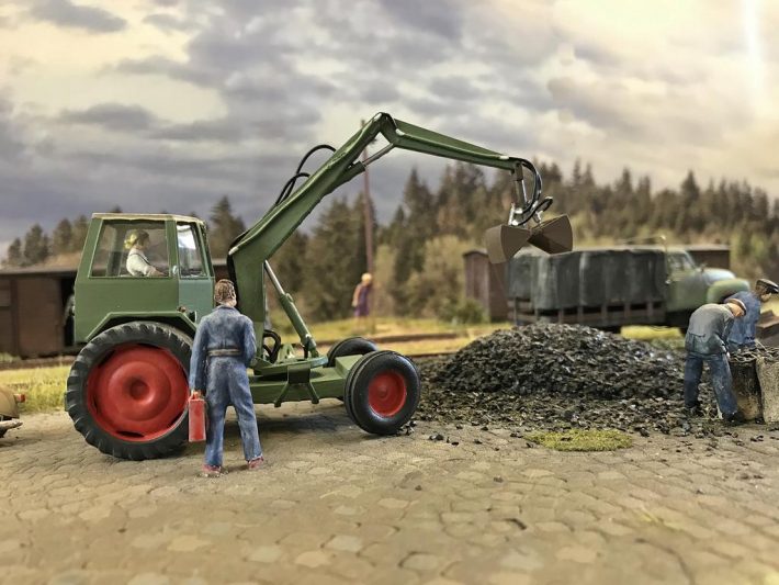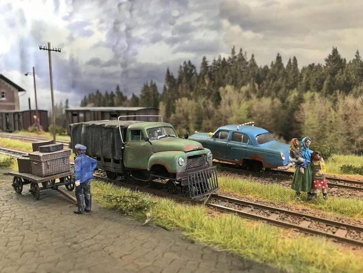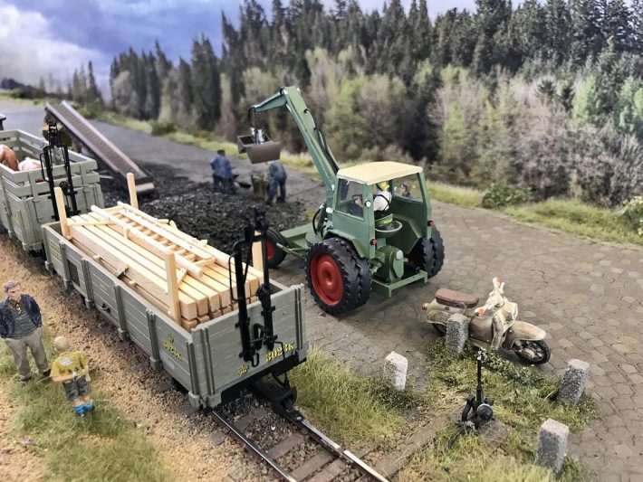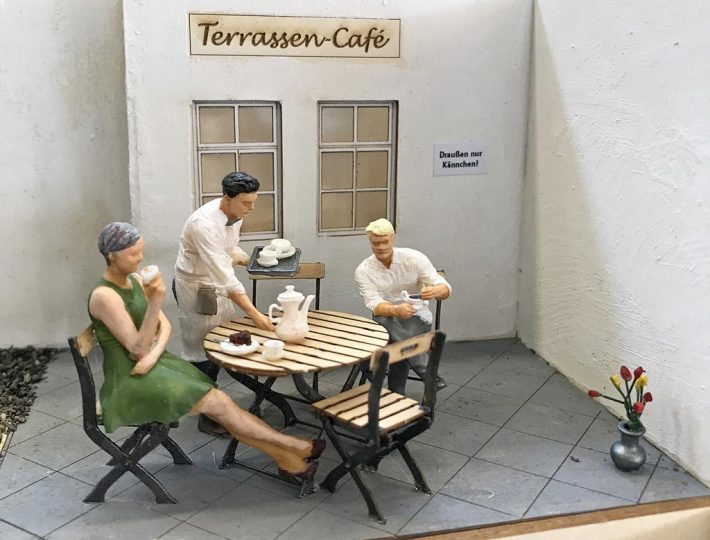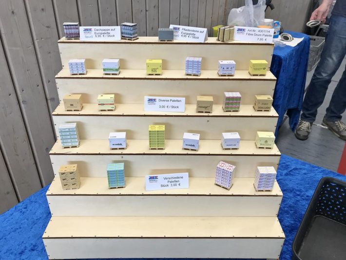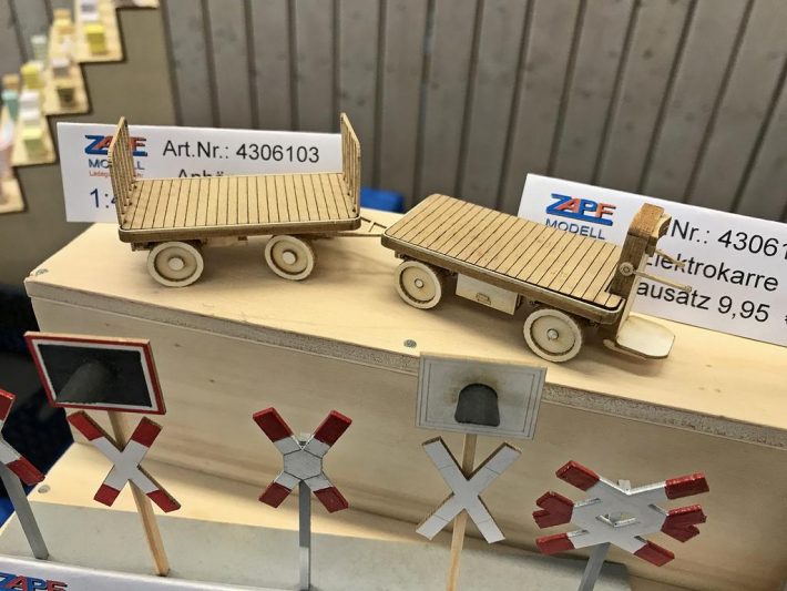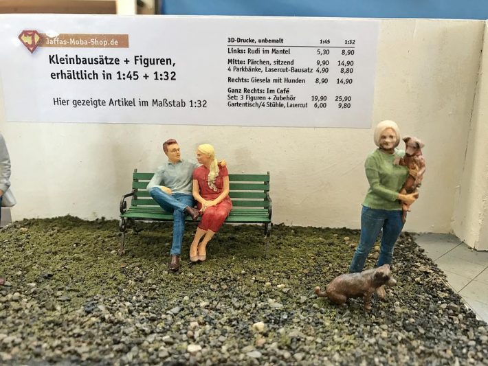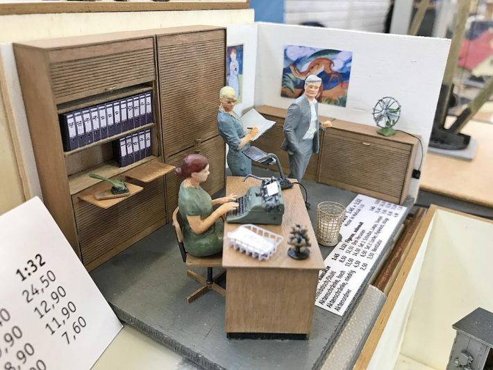 Interessant und sehenswert war auch die neue Produktserie aus dem Hause Jaffa, der die 3D-Drucktechnik mit der Lasercut-Technik zu kleinen durchgestalteten Szenen vereint. Als Beispiel sei hier die Büro-Einrichtung genannt. Vom Mobiliar bis hin zum Stempelhalter und Ventilator, alles passt perfekt zusammen. Aber auch die Szene „Draußen nur Kännchen“ hat ihren Reiz. Dieses Konzept wird zukünftig weiter ausgebaut werden. Die in Dachau zunächst nur in 1:32 gezeigten Heizkörper als Ladegut wird es laut Hersteller in Kürze auch in 1:45 geben.