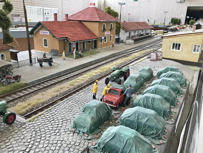 Neben einer Spur 1 Anlage der Siegenburger Modellbahner mit dem Bahnhof „Siegenburg“ und städtischen Motiven, konnte auch die überarbeitete und erweiterte Spur 0-Anlage „Ottobeuren“ bewundert werden. Obwohl diese nun schon einige Jahre gezeigt wird, ist es immer noch ein Genuss, sie anzusehen, mit all den kleinen Szenen und durchgestalteten Gebäuden.