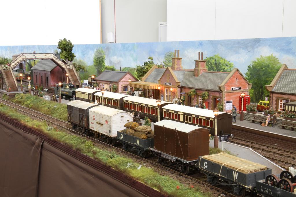 Eine englische Schauanlage mit Motiven einer Museumsbahn war auch vertreten. Das Betriebskonzept ist typisch britisch: Punkt zu Punkt Verkehr von einem Schubladen-Fiddleyard auf der einen zu einem Drehscheiben-Fiddleyard auf der anderen Seite.