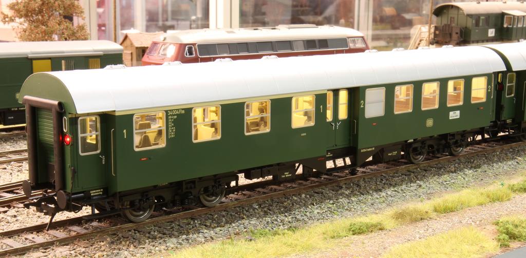 Etwas im Schatten der beiden Triebfahrzeuge stehen die Umbauwagen 4yg, die ebenfalls fertig bedruckt und mit Beleuchtung und Inneneinrichtung zu sehen waren. Gut zu erkennen sind die unterschiedlich gestalteten Sitze der ersten und zweiten Klasse.