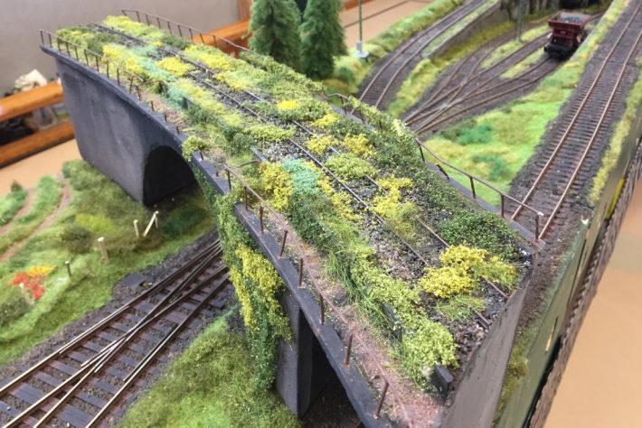Ein Teil der Anlage war mit einer Hintergrundkulisse versehen; dort wurde auch live gebastelt und die Technik des Baumbaues mit Draht einem interessierten Publikum vorgeführt.