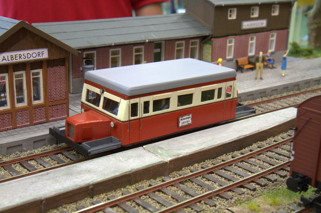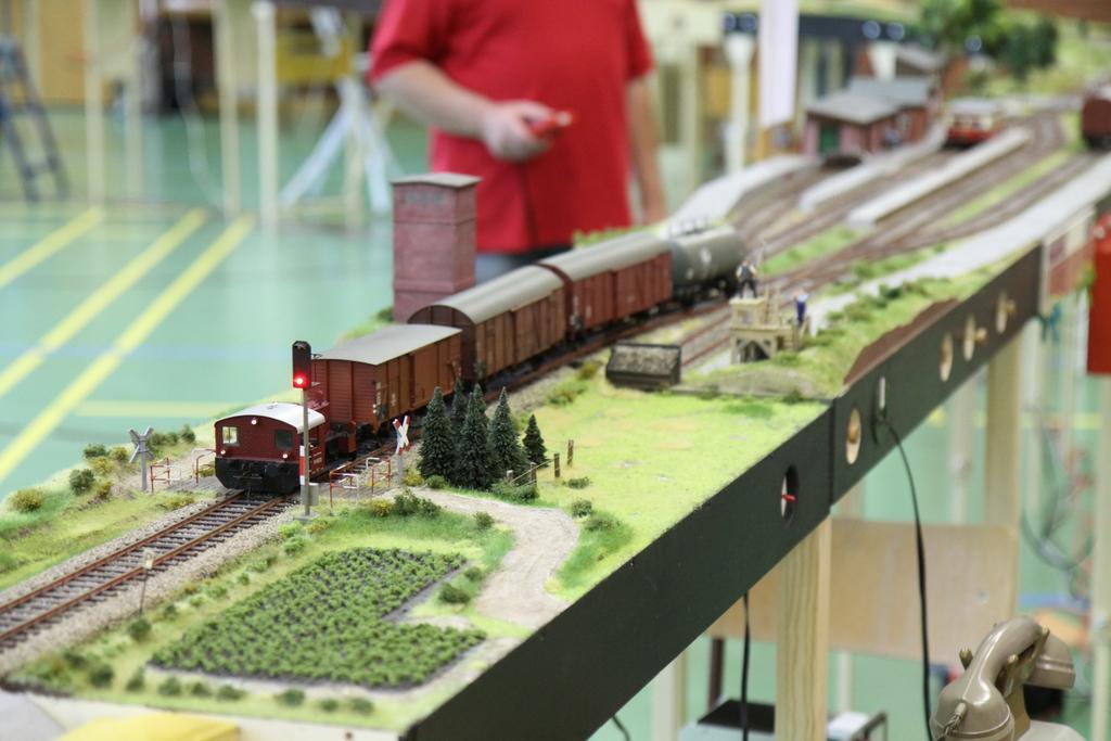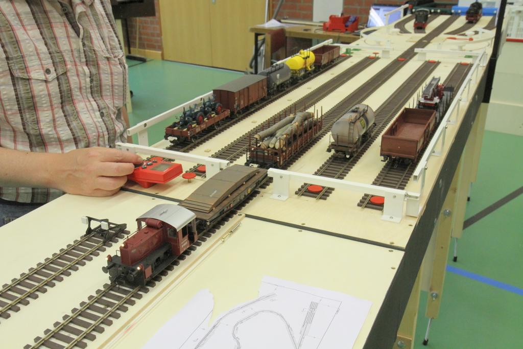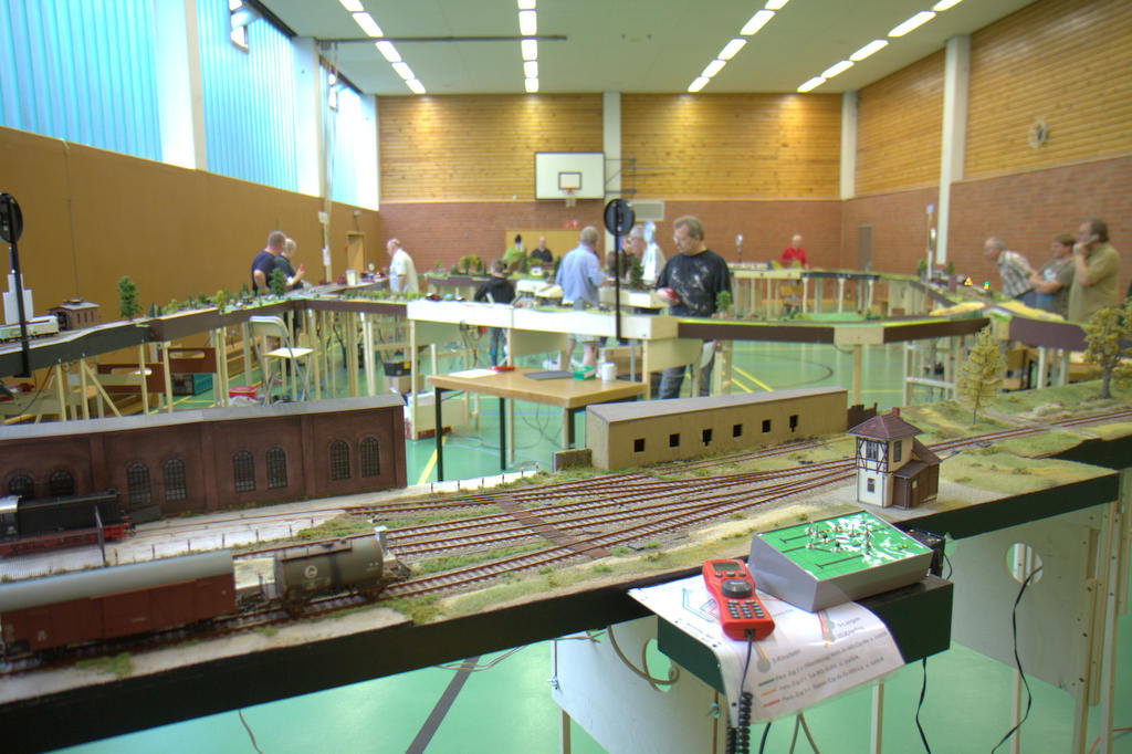 In einer recht hellen Mehrzweckhalle kam so ein Arrangement von etwa 70 Metern zusammen. Drei Abzweige sorgten für einen anspruchsvollen Gleisplan mit fünf Endbahnhöfen, zwei Abzweigbahnhöfen und Betriebsstellen auf der Strecke. Entsprechend anspruchsvoll war der Fahrplan: Drei Personenzüge und vier Nahgüterzüge rollten auf den Strecken, fast jede Betriebsstelle verfügte zusätzlich über Lokomotiven vor Ort.