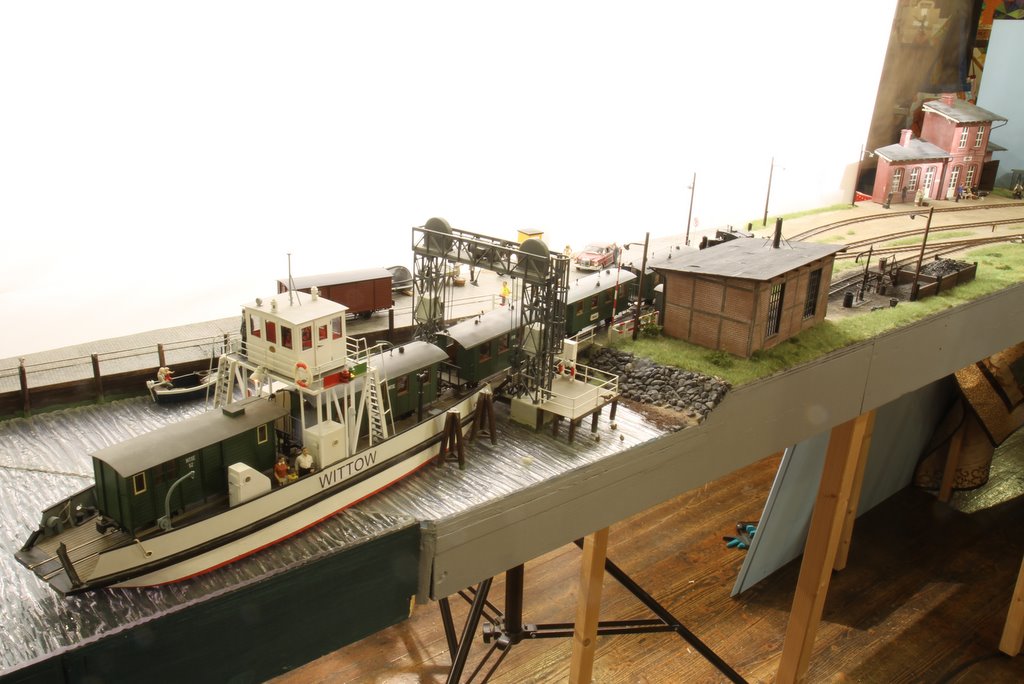 Einigermaßen spektakulär ist die Verbindung der Module an die Module der Rügener Fähre von Michael Schwertfeger. Er hat den Fährbahnhof mit viel Liebe zum Detail als kompletten Eigenbau realisiert. Von allen Modellen wird im SNM noch ausführlicher berichtet werden.