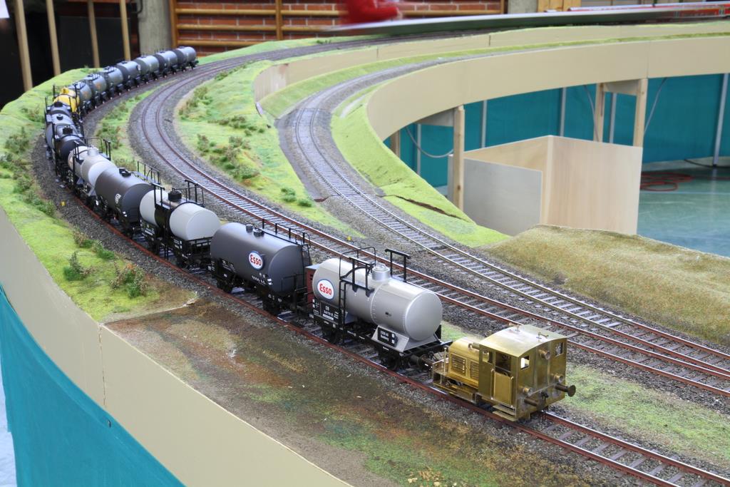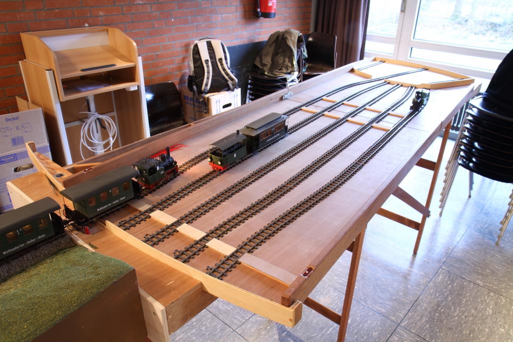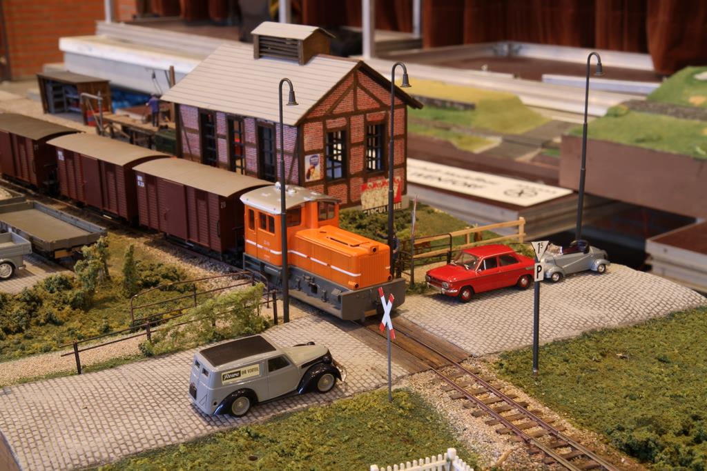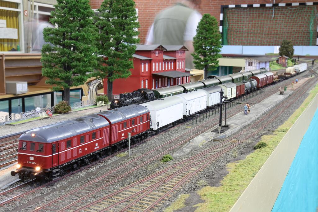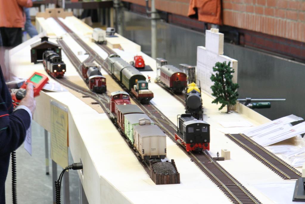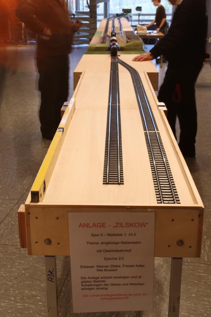 Einige Anlagen waren in der gut beleuchteten Turnhalle aufgebaut, einige in der leider etwas schummerig beleuchtete Aula der Realschule. Im Einzelnen waren es die Wellingdorfer Kellerbahn des Freundeskreises Schmalspurbahnen, und eine Modulanlage von Werner Zilske, Friedel Adler, und Nils Bussert, die noch im Rohbau zu sehen war, aber von jungen Nachwuchs-Modellbahnern rege genutzt wurde. Weiter gab einen ebenfalls noch im Rohbau befindlichen Bahnhof von Uwe Schleicher (Eisenbahnfreunde Bad Oldesoe) und die Modulanlage des 0e Club Hamburg. Die Turnhalle dominierte das große Oval der Arge Spur in Hamburg.