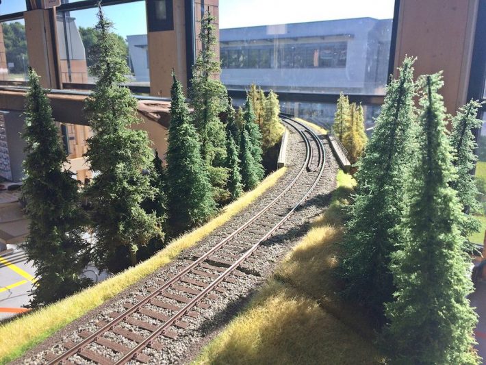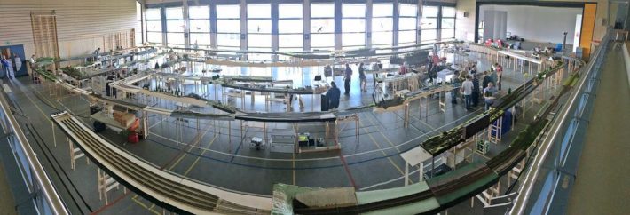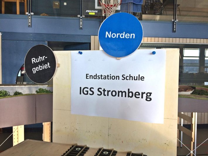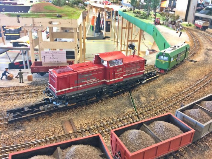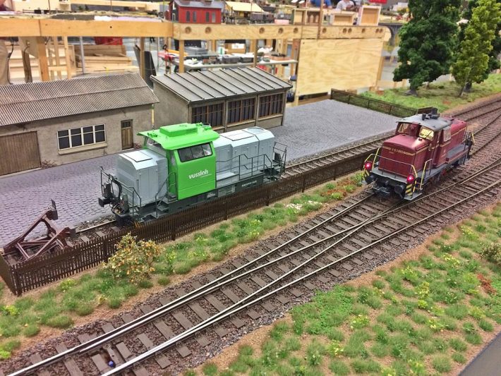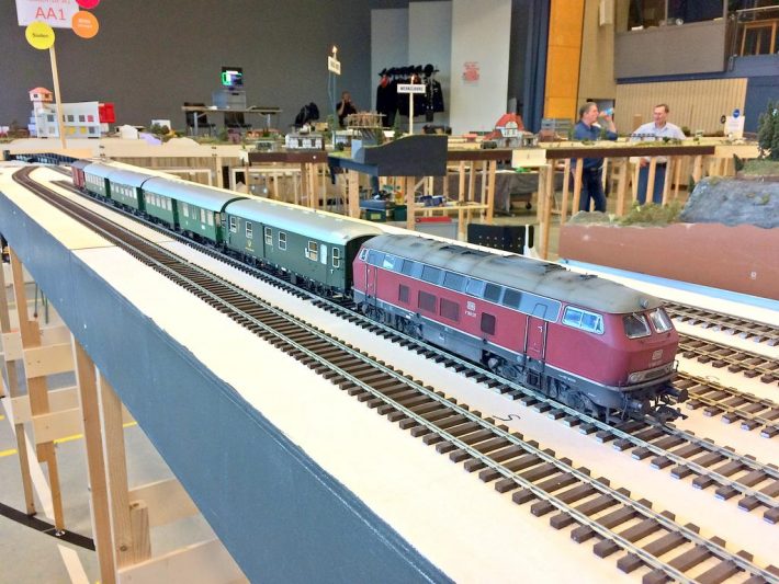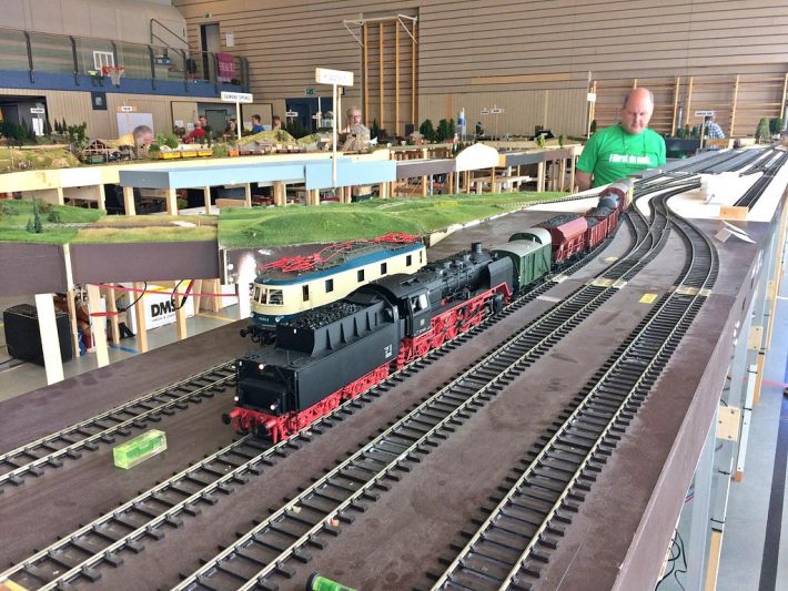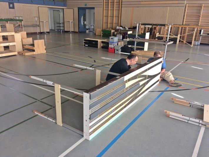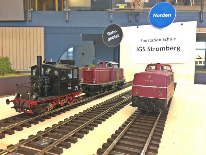 Auch die Jugend war wieder mit von der Partie, in Form der H0-Anlage der Schüler der IGS Stromberg, aber auch als rührige Teilnehmer des Fahrplanbetriebes und Erbauer diverser Strecken-Module sowie eines Fiddle Yard. Obwohl es sehr gedrängt aussieht und kaum große Lücken auszumachen sind, waren wir letztes Jahr mit 296 Metern sogar auf einer längeren Strecke unterwegs.