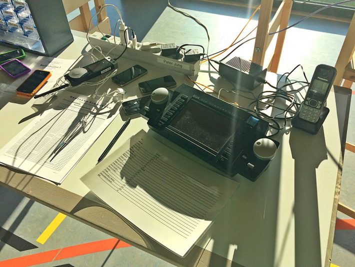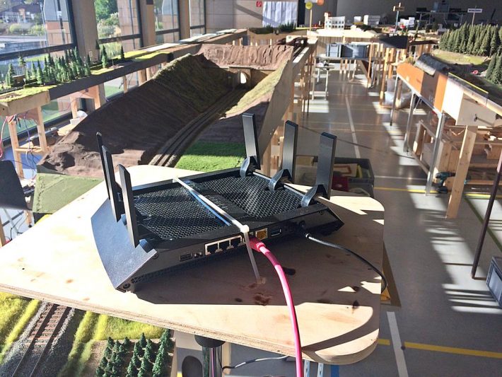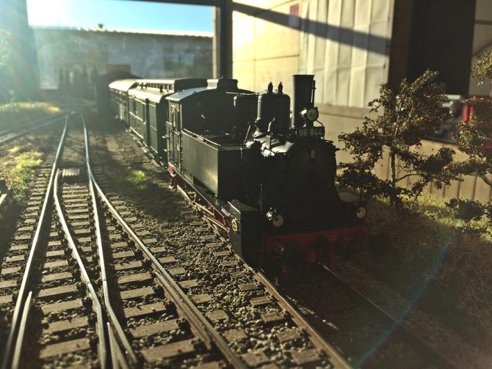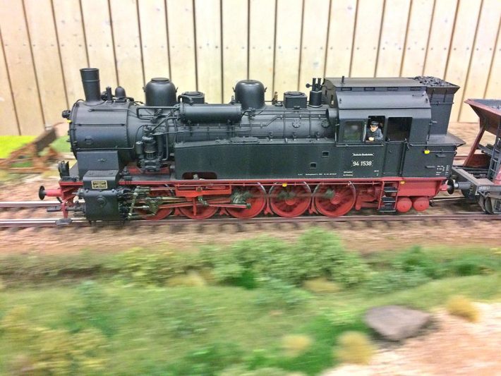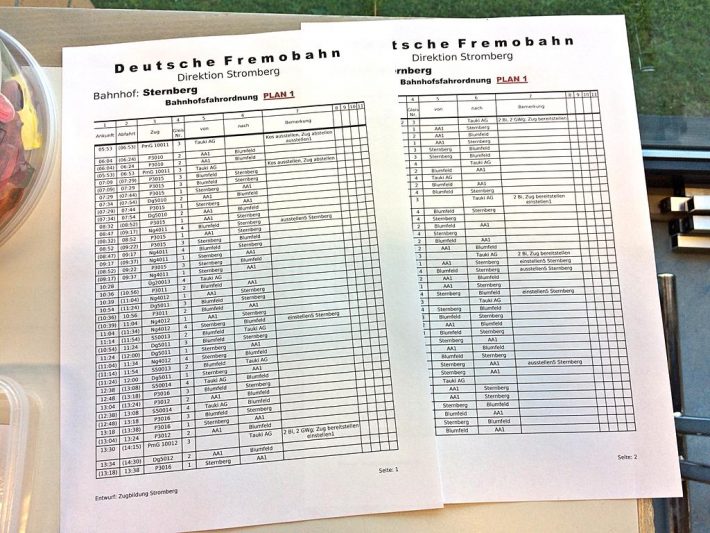 Im Regelspur-Teil wurde sowohl mit den ESU Mobile Control Handreglern gefahren, als auch mit der bewährten TouchCab-Steuerung. Eine neue Sendestation mit verbesserter Sendeleistung macht den problemlosen Einsatz der ESU-Geräte möglich, nachdem es bei den letzten Treffen hier immer mal wieder „Aussetzer“ gegeben hatte. Vor dem Start des ersten Fahrplan-Durchlaufes wurden zunächst noch die Dienste verteilt: Fahrdienstleiter, Nahgüterzüge, Durchgangsgüterzüge und auch ein reiner Personenzug-Dienst standen zur Auswahl. So war für jeden etwas dabei und in der nächsten Fahrplan-Runde konnte dann durchgewechselt werden. Für den Bahnhof Sternberg als zentraler Anlaufpunkt für die Regelspur wurden zusätzlich noch zwei Rangierer benötigt, um den reibungslosen Fahrplanablauf gewährleisten zu können. Das war teilweise ein „Knochen-Job“! Ob ausgiebiges Rangieren, oder einfach mal mit seinem eigenen Rollmaterial den Personenzug-Dienst abzufahren, bei jedem der Akteure war ein „seliges Lächeln“ festzustellen.