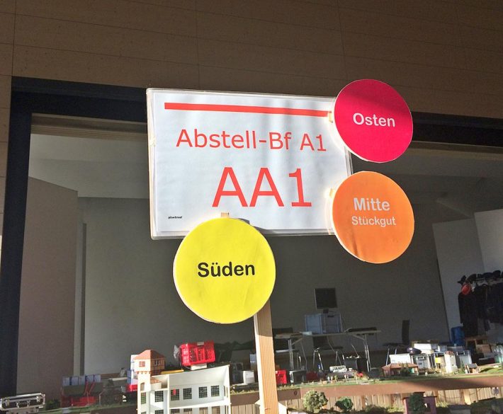 Den regelspurigen Schattenbahnhöfen wurden nach FREMO-System auch Farben zugeteilt, welche die regionale Zuordnung „der großen weiten Welt dahinter“ angaben. Diese Farben wurden durch weithin sichtbare runde Farbschilder an den Bahnhofnamen angezeigt.
